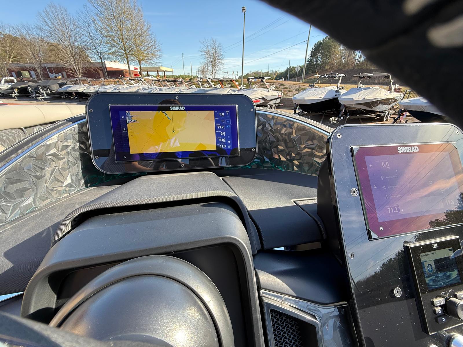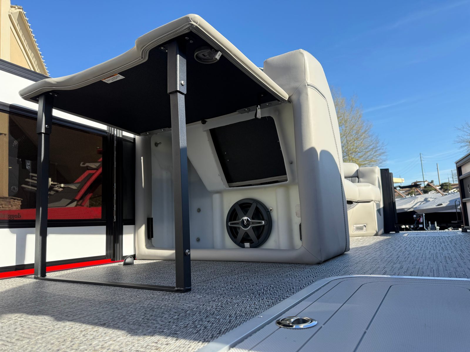 The Barletta Lusso L25UC is packed with special features that elevate your boating experience. The onboard battery charger supports two batteries, ensuring you have plenty of power for extended outings. Exterior lighting, including white underdeck and underwater lights, adds a dramatic flair for evening cruises and enhances safety during nighttime adventures. The furniture is upholstered in Marquesan Gray with Onyx accents, offering plush seating and a modern look, while the Amore Gray flooring is both stylish and durable. The Blackout Package Lusso railskin gives the boat a contemporary edge, and the sweep color in Winter White with Gray Moonstone accents ensures you’ll turn heads wherever you go. Mercury Digital DTS Pre-Rig and Vessel Link integration provide advanced connectivity and control, while hydraulic and power assist steering make handling effortless. Digital gauges keep you informed at a glance, and the rigging includes a stainless steel prop for optimal performance.