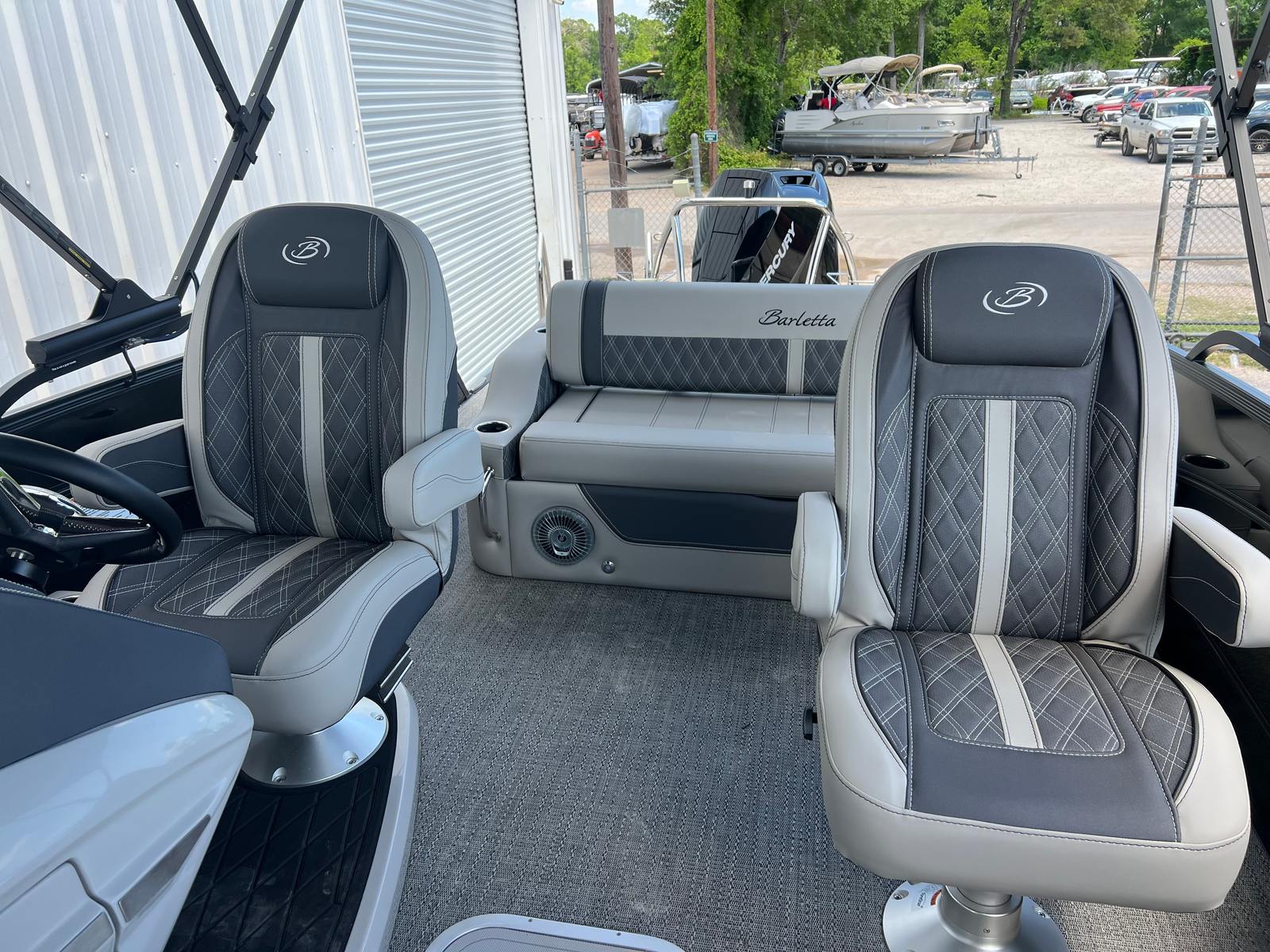 Step aboard the Barletta Lusso L25UC and you will immediately notice the Marquesan Gray furniture with Charcoal Accent, creating a sophisticated and inviting atmosphere. The Amore Gray flooring adds a touch of elegance underfoot, while the Black Diamond accent color on the exterior gives the boat a bold and modern look. The adjustable pedestal on the captain’s chair ensures optimal comfort and visibility for the captain, while the helm windshield provides protection from wind and spray, enhancing the overall boating experience.This pontoon is equipped with a double bimini, including an additional power bimini, offering ample shade and protection from the sun. The Metal Jacket Protectant on the exterior helps maintain the boat’s pristine appearance, making cleaning and maintenance a breeze. The rigging includes a V10 prop, perfectly matched to the Mercury engine for optimal performance and efficiency.Inside, you will find a table with a pedestal and base, complete with Yeti-ready cupholders, making it easy to enjoy snacks and drinks while socializing. Every detail of the Lusso L25UC is designed with comfort and convenience in mind, ensuring that every outing is memorable.
