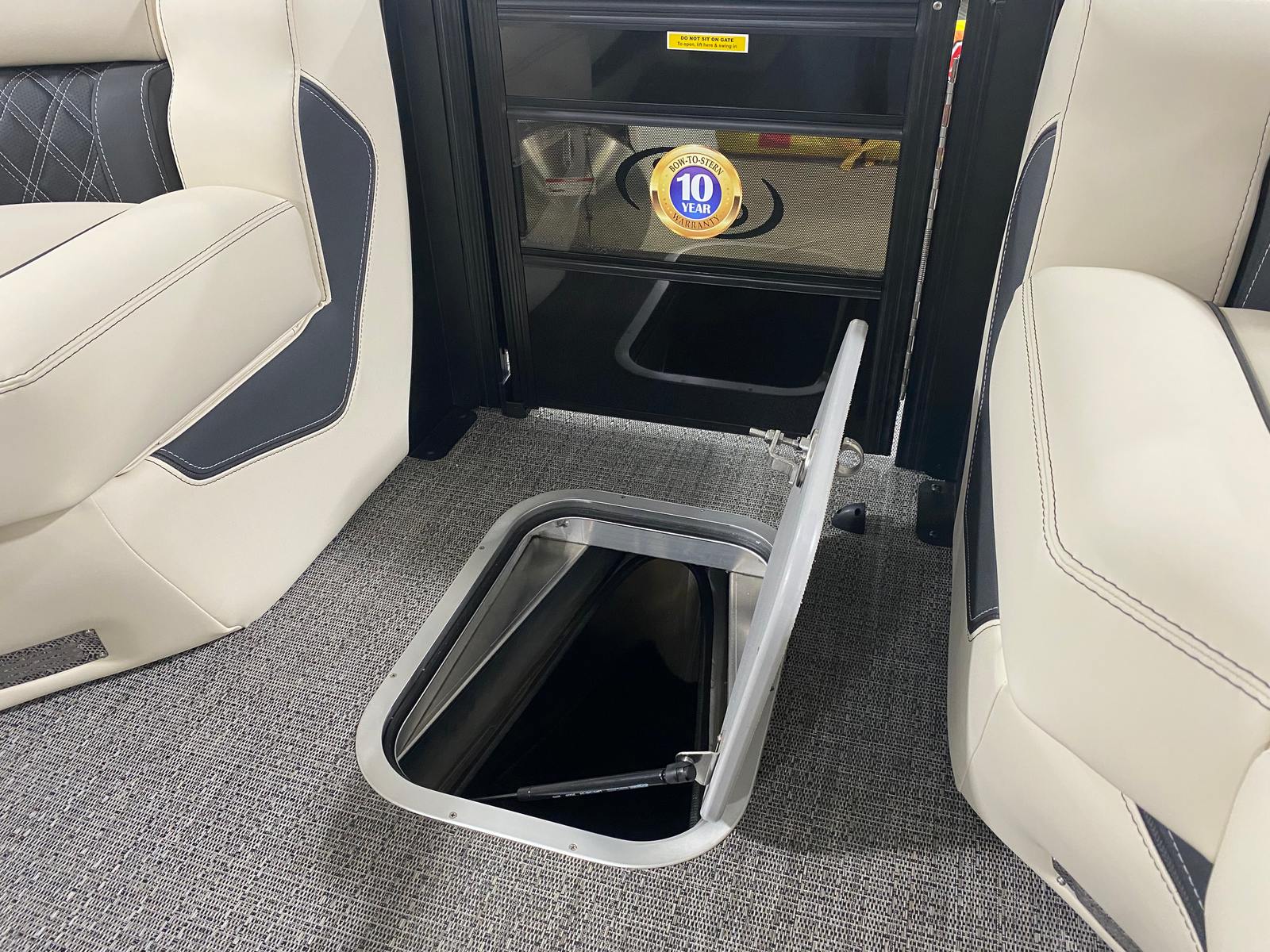 Step aboard the Lusso L25UCA and you’ll immediately notice its attention to detail and premium finishes. The Blackout Package Lusso railskin adds a touch of sophistication, while the furniture in Linen with Onyx creates a welcoming and stylish atmosphere. The flooring, finished in Amore Gray, is both elegant and practical, providing comfort underfoot and easy maintenance. Exterior lighting, including white underdeck and underwater lights, enhances the ambiance for evening cruises and adds a layer of safety when navigating after sunset.The Lusso L25UCA is designed for those who appreciate the finer things in life. Every element, from the color scheme to the furniture selection, has been chosen to create a harmonious and luxurious environment. The spacious deck layout allows for flexible seating arrangements, perfect for socializing, sunbathing, or enjoying a meal with loved ones. The pontoon’s sturdy construction and high-quality materials ensure durability and longevity, so you can enjoy your investment for years to come.