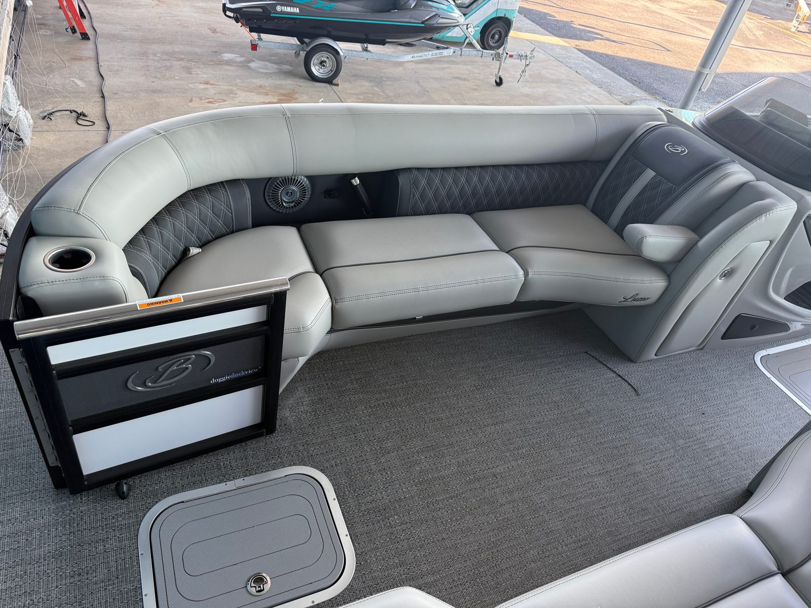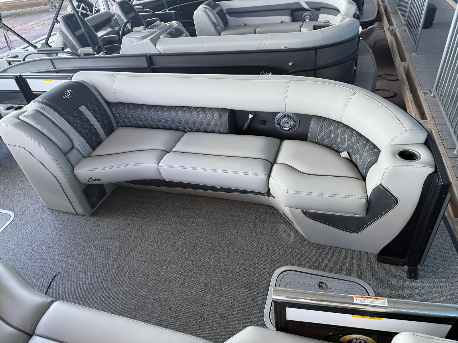 The Lusso L25UCA is packed with premium features designed to enhance your time on the water. The Winter White sweep color paired with Gray Moonstone accents creates a sophisticated and modern look, complemented by the Blackout Package Lusso railskin for added elegance. Inside, the Marquesan Gray furniture with Onyx detailing offers plush comfort and contemporary style, while the Amore Gray flooring provides durability and easy maintenance.The Coastal Edition Lusso adds a touch of exclusivity, ensuring your pontoon stands out from the crowd. The onboard battery charger with two batteries keeps your electronics powered throughout your adventures, so you can focus on enjoying the day without worry. Every detail, from the rigging to the flooring, is meticulously crafted to deliver a superior boating experience.