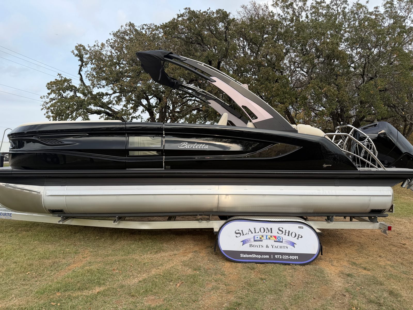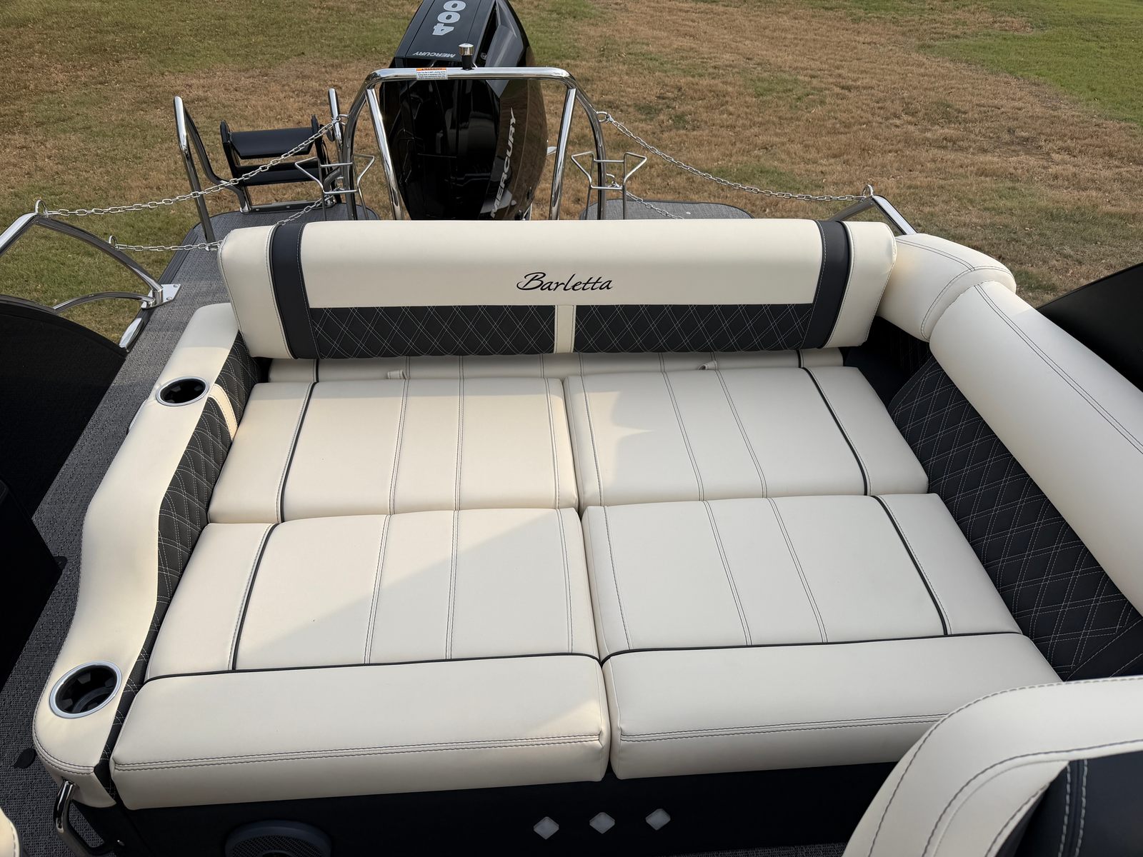 The 2026 Barletta Reserve Leggera 23UCA is a brand-new pontoon boat that measures an impressive 25.5 feet in length. This spacious layout provides ample room for friends and family, ensuring everyone can relax and enjoy the ride in comfort. The sleek, all-black exterior color gives this pontoon a modern and commanding presence on the water, while the Amore Gray flooring and Linen with Onyx furniture create a refined and inviting atmosphere. Whether you are cruising a calm lake or hosting a lively gathering, this Barletta boat for sale stands out with its stylish design and attention to detail.