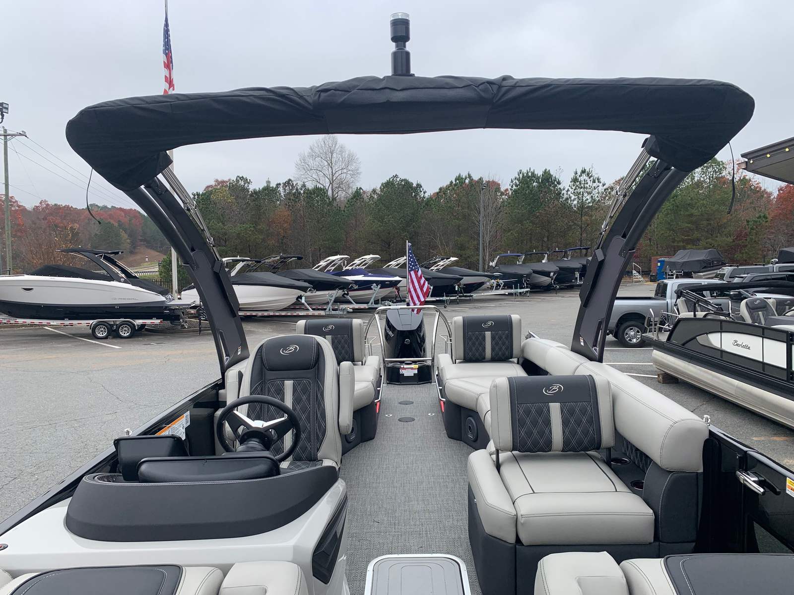The 2026 Barletta Reserve Leggera R26MA is packed with premium features designed to elevate your boating experience. The standard all-black color scheme exudes sophistication, while the Marquesan Gray with Onyx furniture offers both comfort and style. The Amore Gray flooring is not only visually appealing but also durable and easy to maintain, ensuring your boat remains pristine for years to come. The interior is thoughtfully designed with an aft divider, providing added privacy and versatility for passengers.The helm is equipped with the innovative AccuThruster System, which enhances maneuverability and control, making docking and navigating tight spaces a breeze. Please note that the AccuThruster System deletes the rear cooler and anchor storage on the stern deck, allowing for a more streamlined and functional layout. Every detail of this Barletta boat for sale is meticulously crafted to deliver the ultimate in comfort, convenience, and performance.