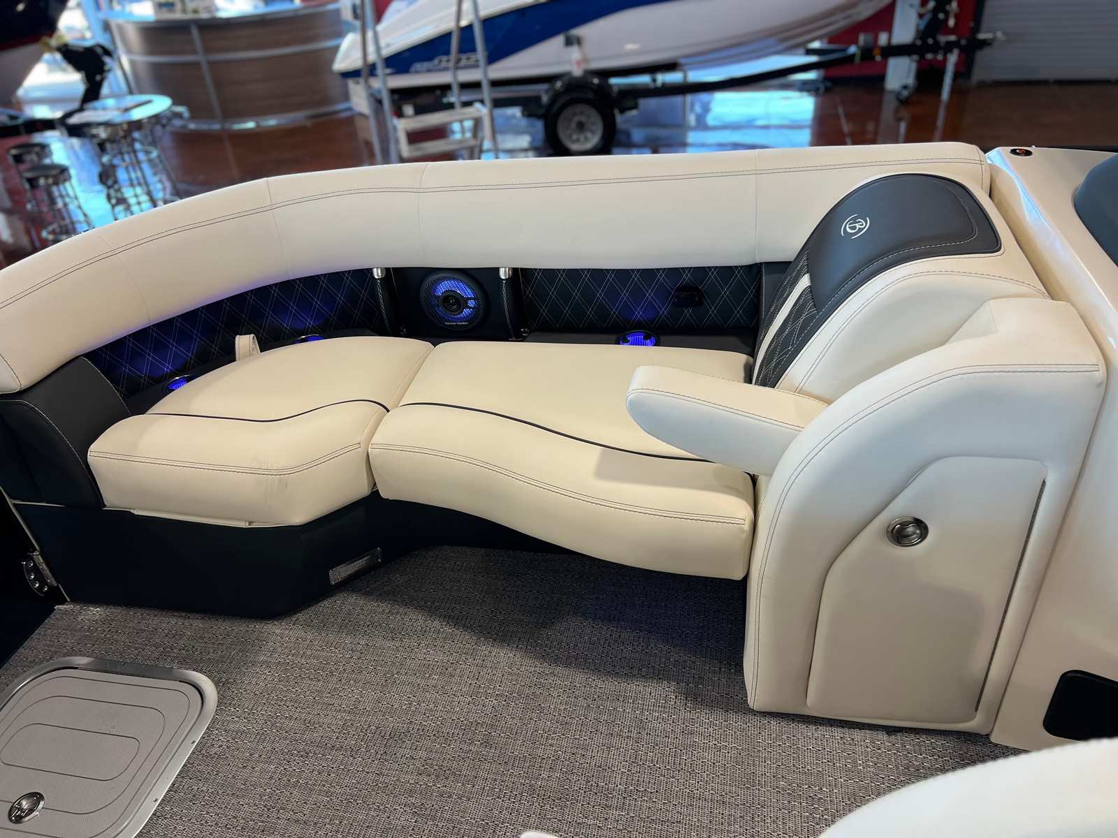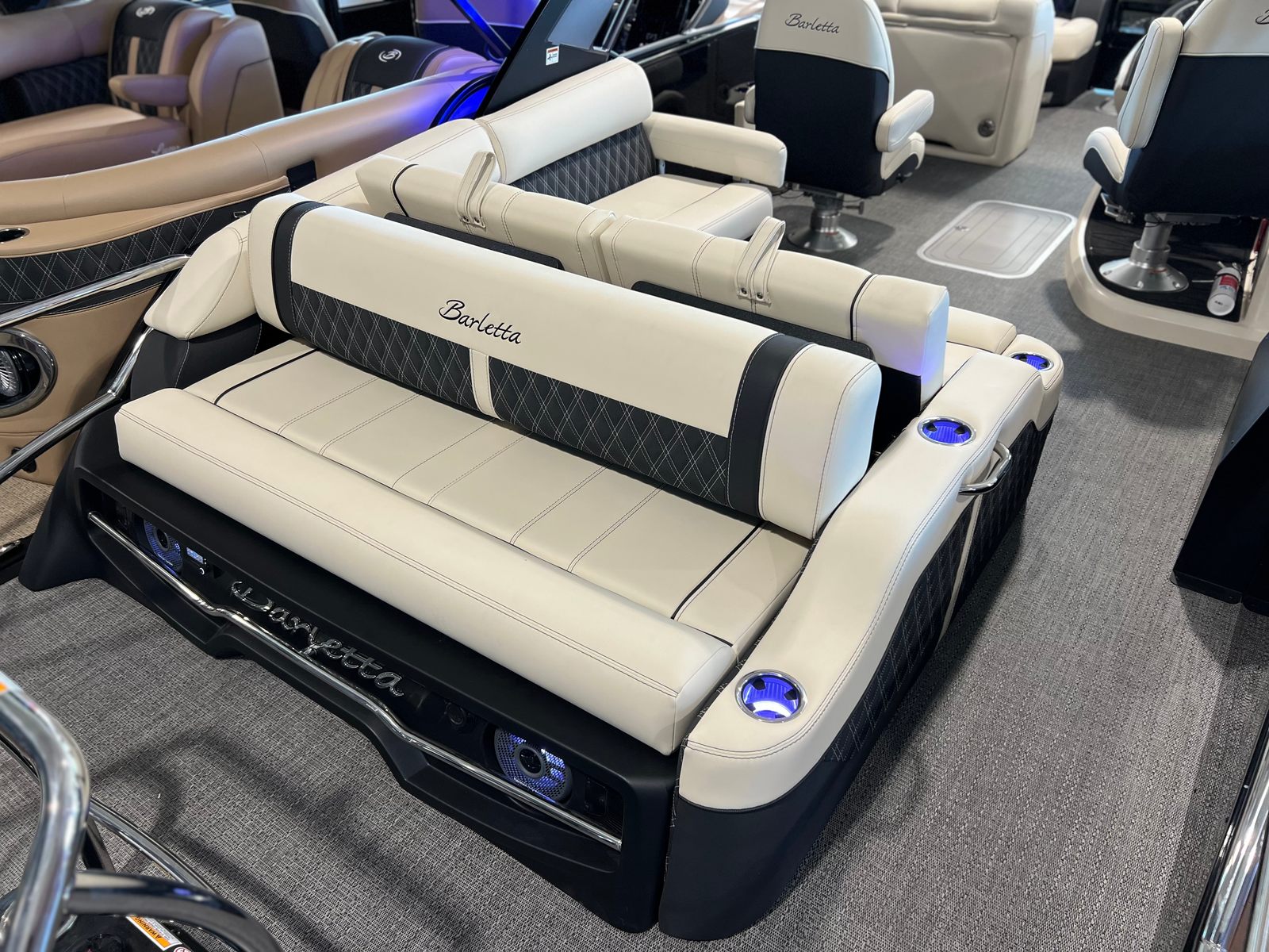 The Barletta Reserve Leggera R26UCA is a 2026 pontoon boat that stretches an impressive 28.5 feet in length, offering ample space for family, friends, and guests. Its sleek, all-black exterior is complemented by elegant linen furniture with onyx accents, creating a sophisticated atmosphere that’s perfect for entertaining or relaxing. The Amore Gray flooring adds a modern touch, ensuring every detail of this pontoon is designed with both aesthetics and durability in mind. As a new pontoon boat for sale, this Barletta model represents the latest in marine innovation and craftsmanship.