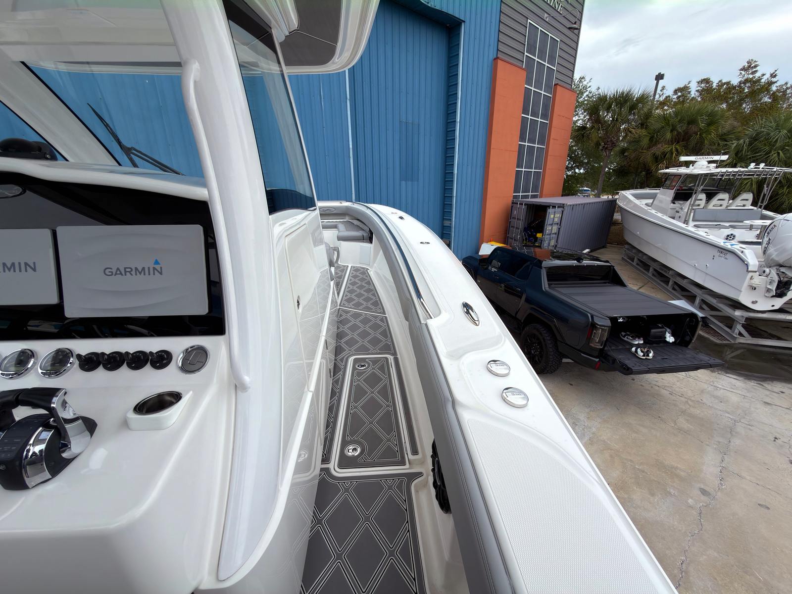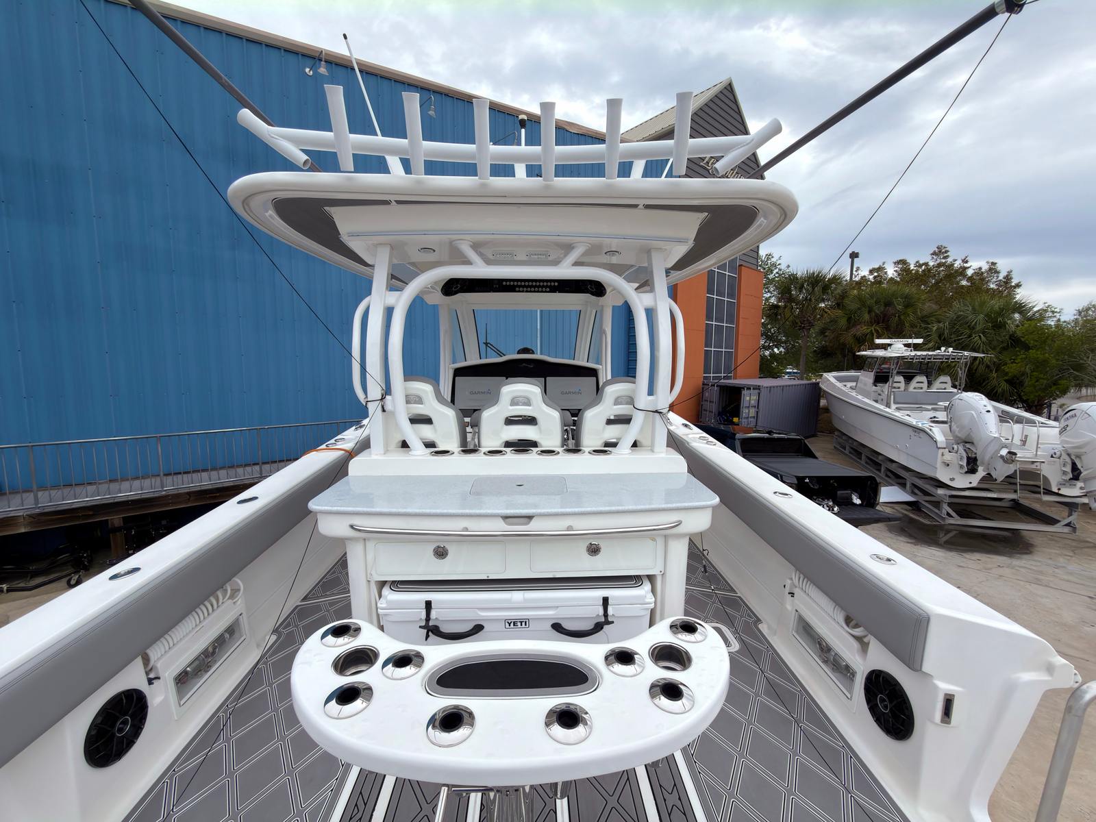 The cockpit is built for action, with wide open deck space, substantial bolsters, a rigging-friendly transom setup, and an impressive amount of rod and cup holder storage throughout. The leaning post and aft mezzanine-style seating create a highly functional social and fishing space, while the oversized hardtop, upper rod storage, and glass windshield provide excellent helm protection.