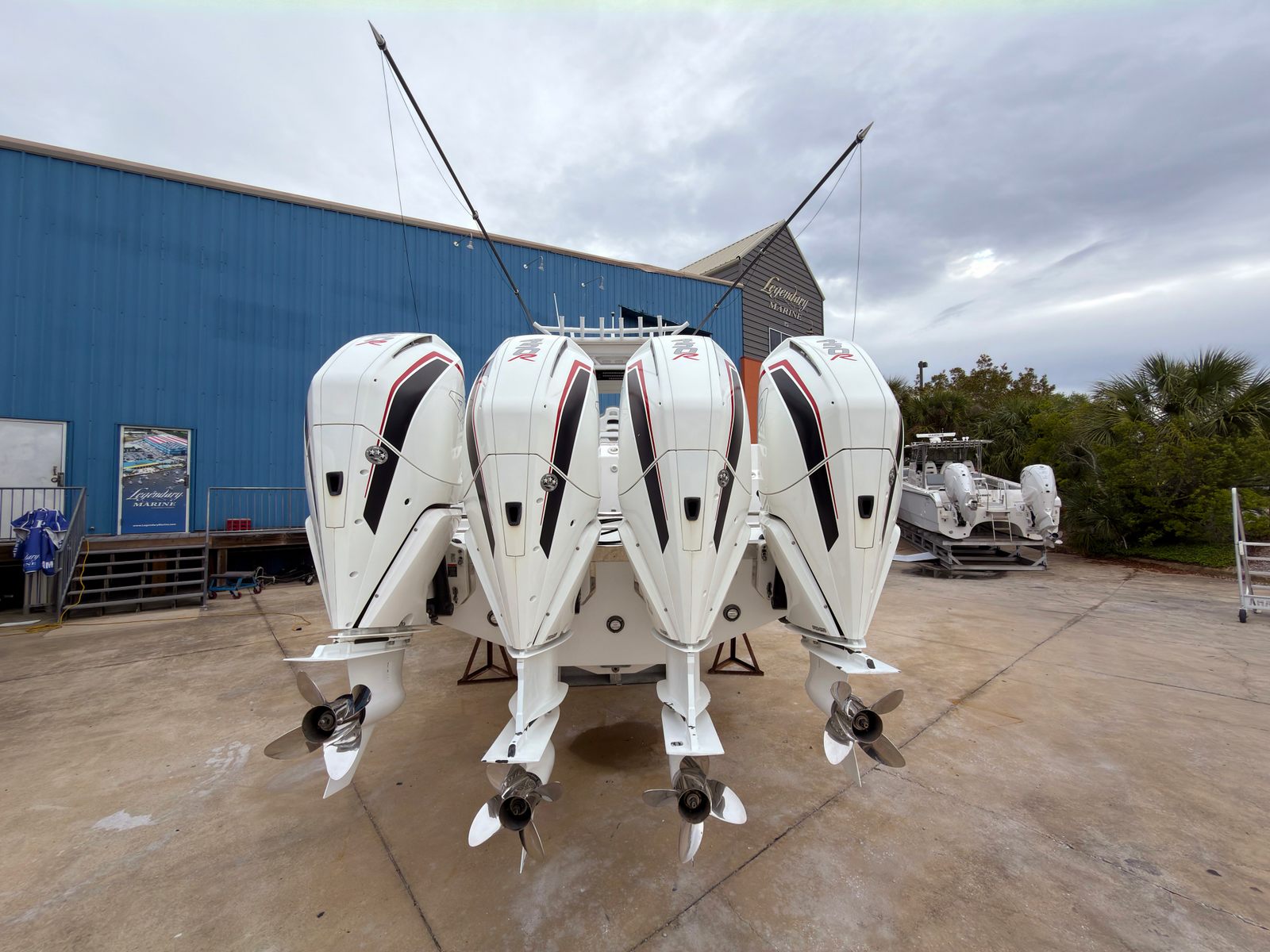 The professionally completed repower with quad Mercury 450Rs gives this boat a major advantage for the next owner. The updated power package brings modern performance, strong acceleration, and the reliability and appeal that buyers are looking for in today’s market. The white 450Rs pair perfectly with the boat’s clean profile and give the transom an unmistakable custom look.