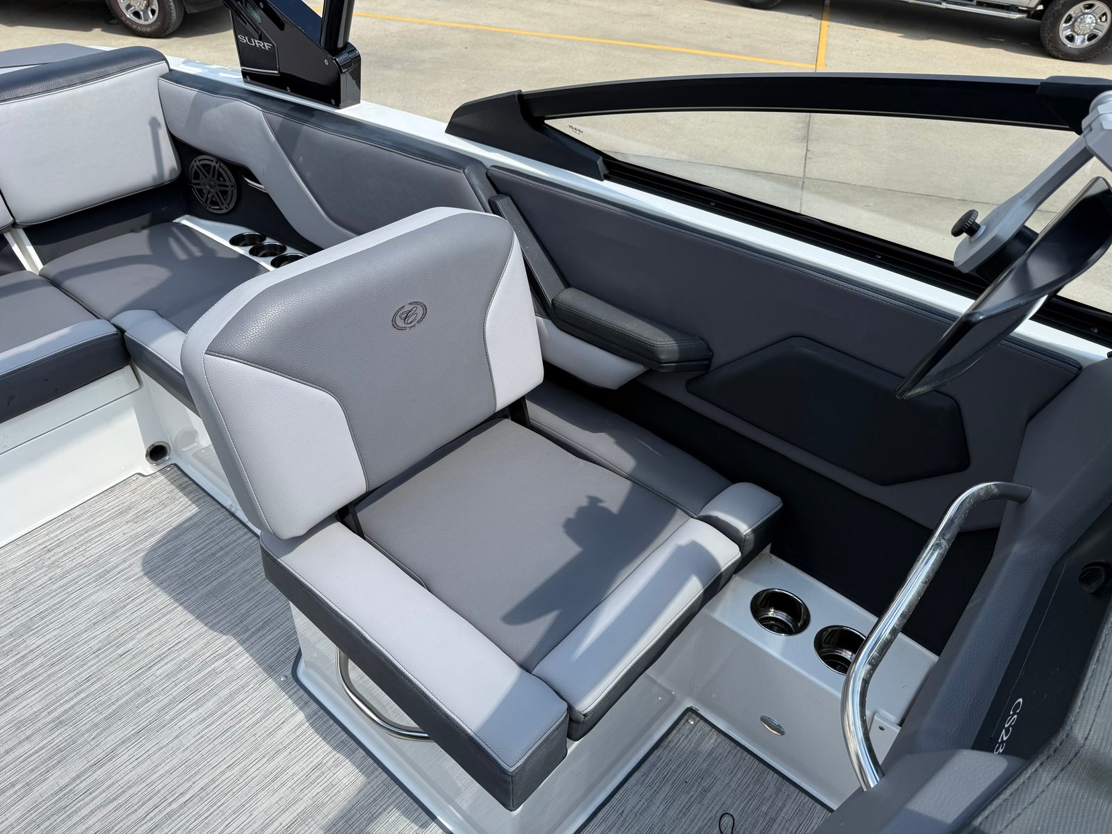 Under the hood, the 2024 Cobalt CS23 Surf is powered by a robust 300-horsepower engine, delivering the kind of exhilarating performance that water sports enthusiasts crave. With just one engine and only 80 hours of use, this bowrider boat for sale is primed for many more seasons of reliable fun.The CS23 Surf’s engine is engineered for smooth acceleration, responsive handling, and impressive top speeds, making it ideal for wake surfing, tubing, or simply cruising across the lake. The single-engine setup simplifies maintenance and operation, while the advanced hull design ensures a stable, comfortable ride even in choppier conditions. Whether you’re carving through waves or enjoying a leisurely sunset cruise, the CS23 Surf offers a dynamic and enjoyable boating experience.