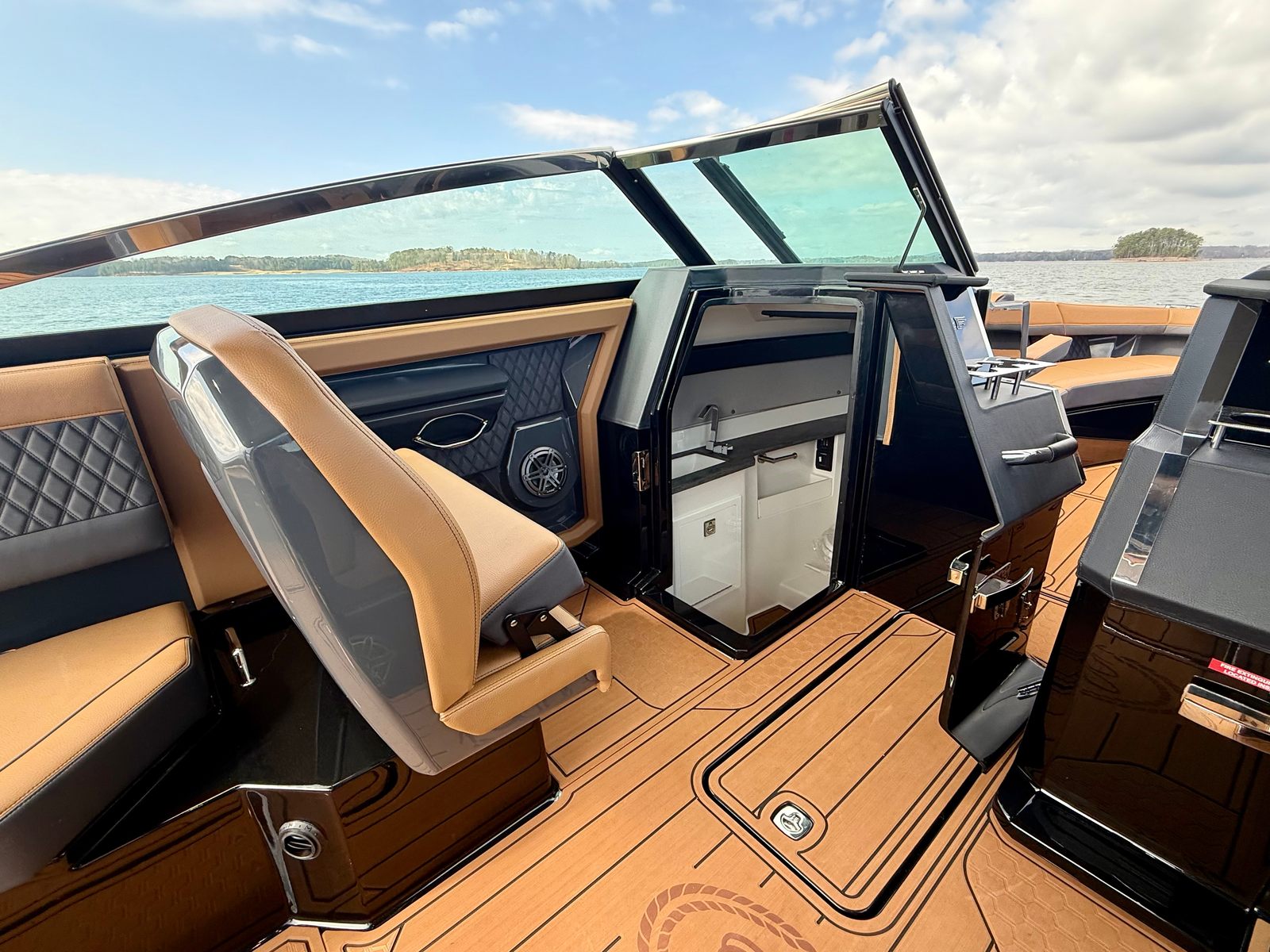 The Cobalt R33 Surf is packed with premium features that elevate your boating experience. The arch with hard top provides both style and functionality, offering shade and protection from the elements while maintaining an open and airy feel. The electric awning in sleek black extends effortlessly, creating a comfortable space for relaxation or entertaining guests. The aft walk-thru gate and boarding door make it easy to access the water or dock, enhancing safety and convenience for everyone on board.Inside, the cockpit showcases a luxurious interior finished in Caramel, Carbon, and Ebony, creating a sophisticated and inviting atmosphere. The Cobalt letters with flag emblem in black satin add a touch of elegance and brand distinction. For those cooler days on the water, the cockpit heater ensures that everyone stays warm and comfortable, extending your boating season well into the cooler months.Additional features such as the battery maintainer/charger (110V) keep your boat ready for action, while the board rack covers and PTM provide practical solutions for storing and protecting your gear. Every detail of the R33 Surf is designed with the owner’s comfort and convenience in mind.