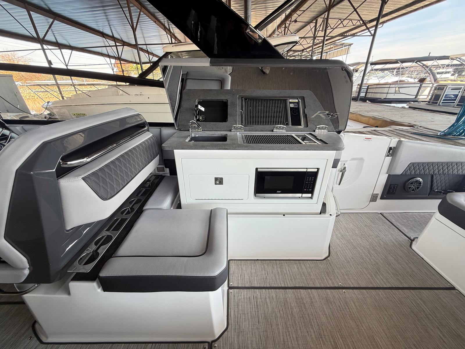 The Cobalt R35 is designed with practicality in mind, making ownership effortless and enjoyable. The cockpit boarding door streamlines entry and exit, especially when docked or rafted up with other boats. The air compressor is a handy addition for inflating paddleboards, tubes, or other water accessories, ensuring you’re always ready for fun.Storage solutions throughout the boat keep your gear organized and accessible, while the bow tonneau cover protects your belongings from the elements. The dual engines not only provide powerful performance but also contribute to easier docking and maneuvering, making the R35 a great choice for both experienced captains and those new to boating.Fuel efficiency is enhanced by Cobalt’s commitment to engineering excellence, allowing you to spend more time on the water and less time refueling. The compliance with California engine requirements ensures you can enjoy boating in regulated waters without concern.
