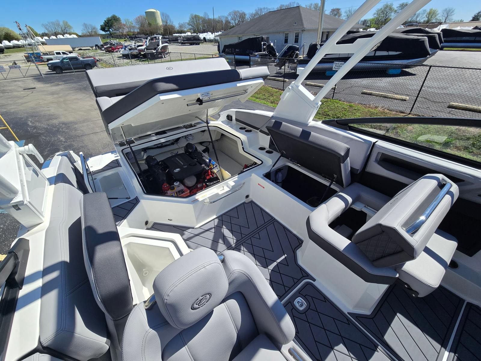 The Cobalt R4 Bowrider is designed with practicality in mind, making ownership easy and enjoyable. The stainless steel docking lights enhance visibility during low-light conditions, simplifying the docking process and increasing safety. The fire extinguisher with an automatic system adds an extra layer of protection, giving you confidence every time you set out.The Sof-Trac Mat at the helm provides a comfortable and secure footing for the captain, even during long days on the water. The dual Garmin 8310 displays in the glass cockpit offer comprehensive navigation and system monitoring, helping you plan routes, track performance, and stay informed throughout your journey.With its spacious design, the Cobalt R4 offers plenty of room for gear, water toys, and personal items, making it easy to prepare for any adventure. The efficient Volvo V8 engine ensures you spend less time refueling and more time enjoying the water, while the single-engine configuration simplifies maintenance and operation.