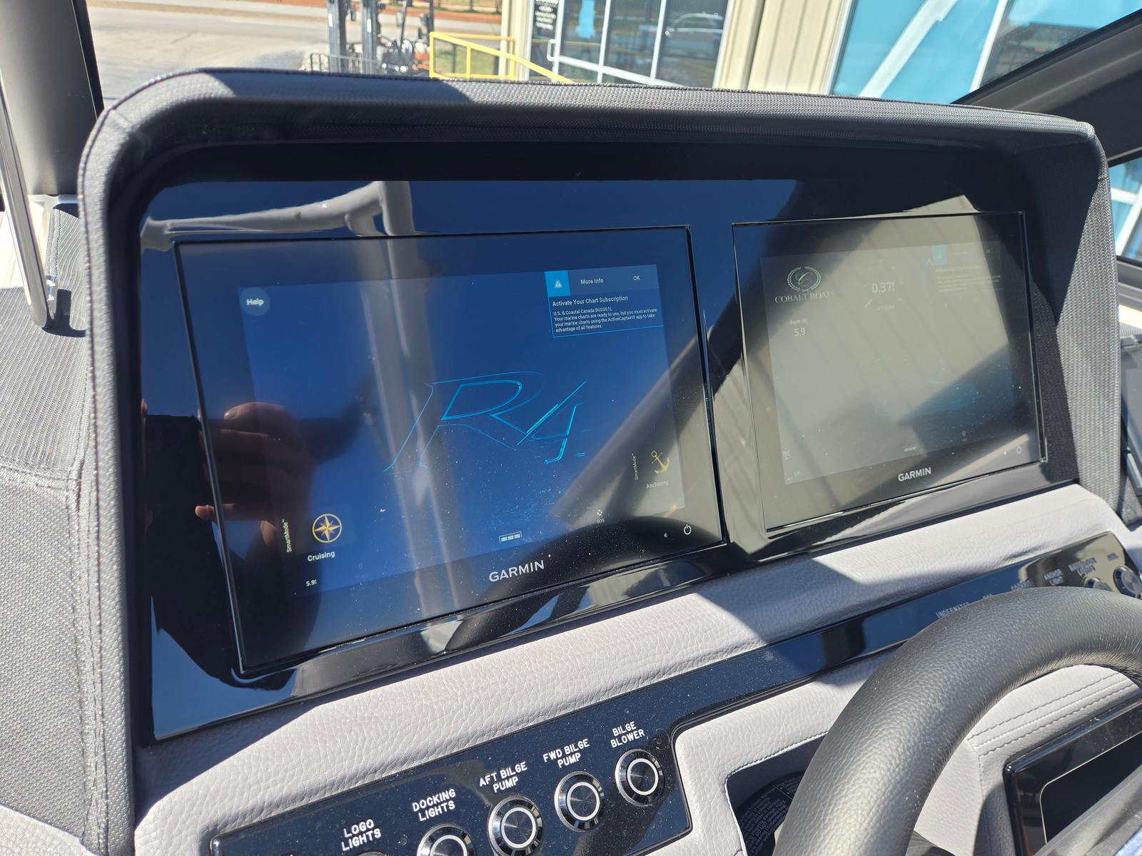 The 2026 Cobalt R4 is packed with special features that set it apart from other Bowrider boats for sale. The obsidian windshield not only enhances the boat’s aesthetic appeal but also provides excellent visibility and protection. The Sof-Trac Mat at the helm, finished in gray and ebony, ensures comfort and safety for the captain, while the black leather and stainless steel steering wheel adds a touch of luxury to your command center.LED interior accent lighting in red, green, and blue creates a vibrant atmosphere for evening cruises and social gatherings. The hull side in graphite gray is both stylish and durable, and the stainless steel docking lights make nighttime docking safer and easier. The fire extinguisher with an automatic system offers peace of mind, while the Cobalt letters in black satin showcase the brand’s commitment to quality and attention to detail.The glass cockpit is equipped with dual Garmin 8310 displays, providing advanced navigation and system monitoring capabilities. This state-of-the-art setup ensures you have all the information you need at your fingertips, making every journey more enjoyable and stress-free.