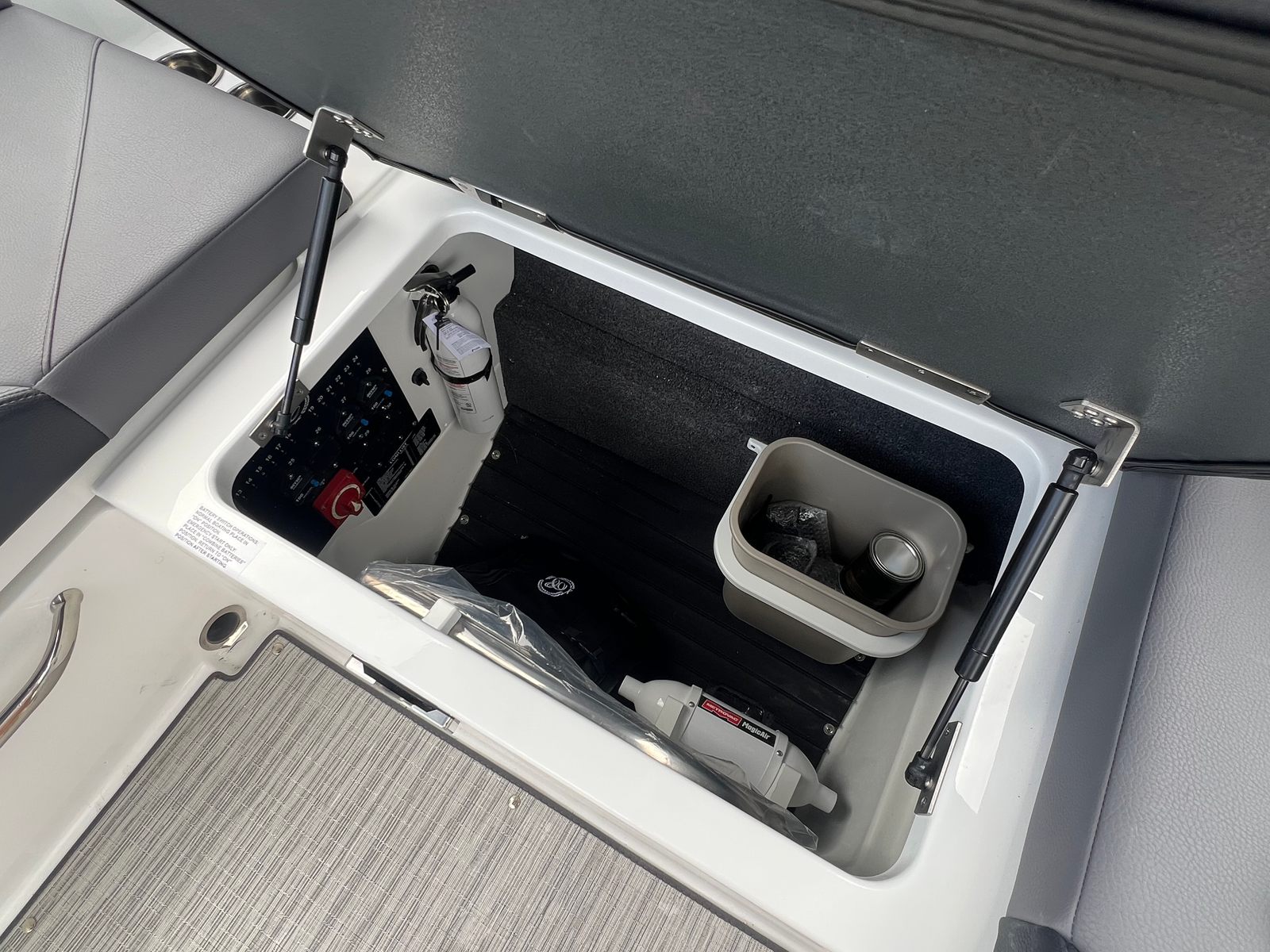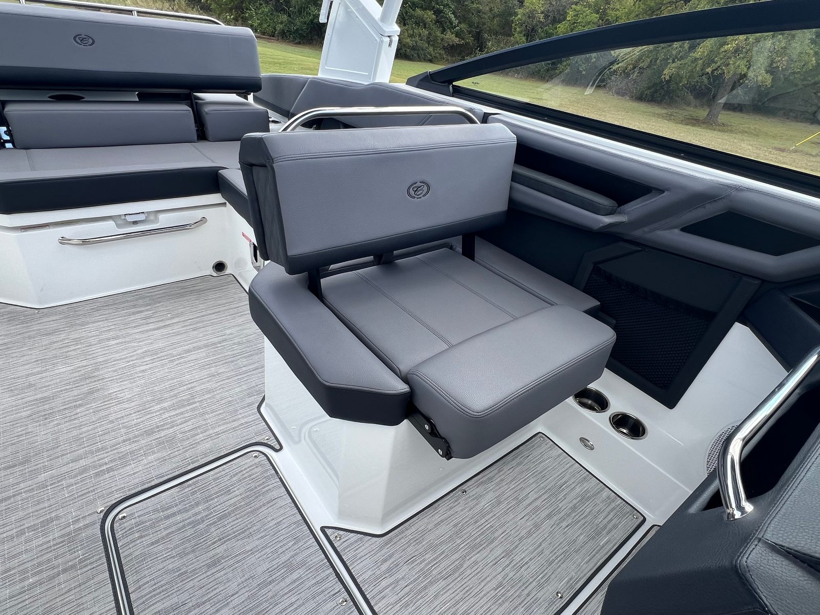 The Cobalt R4 Bowrider is designed with practicality in mind, offering features that make ownership both easy and enjoyable. The battery maintainer/charger keeps your boat’s electrical system in top condition, reducing maintenance hassles and ensuring reliable starts every time. The air compressor with holder is a handy addition for inflating water toys, paddleboards, or other equipment, making it simple to switch between activities.Stainless steel docking lights enhance safety and convenience during nighttime docking, while the electric adjustable seat allows for effortless customization to suit your preferences. The bow filler cushions and aft-facing rumble seat provide flexible seating arrangements, accommodating different group sizes and activities. The solid teak dinette table adds a touch of elegance and practicality, creating a perfect spot for meals or games on the water.