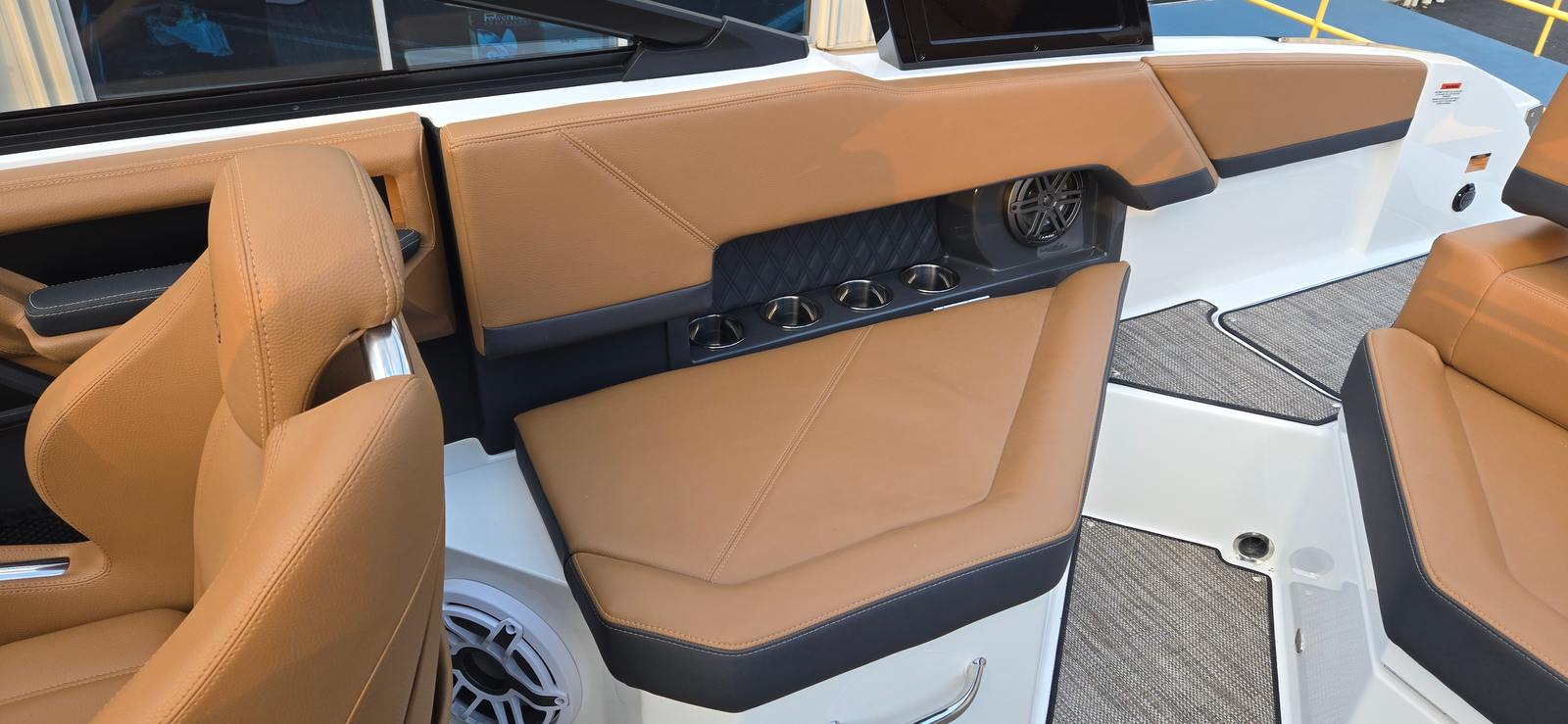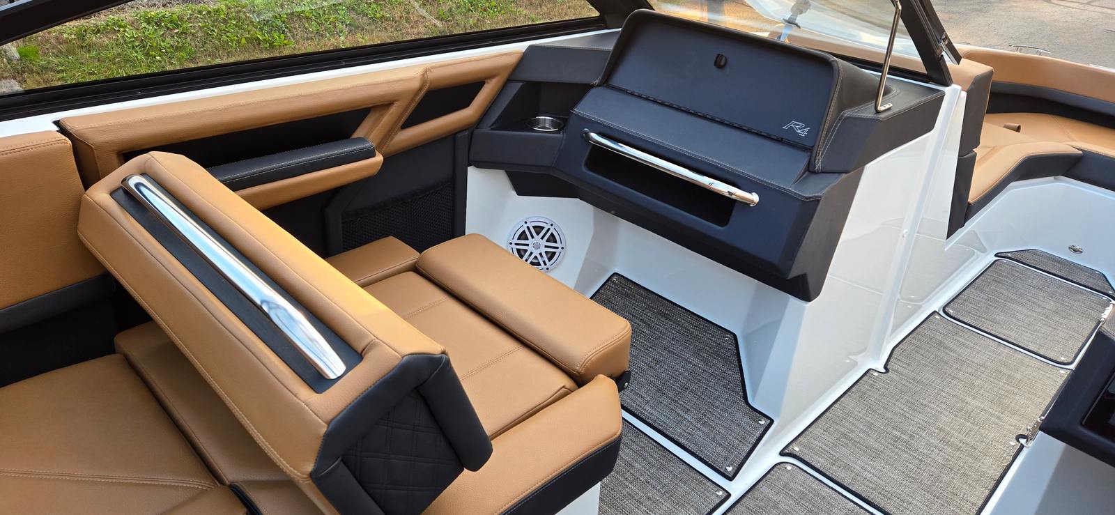 The 2026 Cobalt R4 Bowrider is packed with premium features that elevate your boating experience. The hull side and bottom are finished in Bayside Blue, complemented by a Rich Ebony accent stripe for a striking visual appeal. Step aboard and you’ll be greeted by a luxurious interior in Caramel and Carbon tones, creating a warm and inviting atmosphere for you and your guests.One of the standout features is the aft-facing rumble seat, perfect for relaxing and enjoying the scenery while anchored or docked. The Arch E2 Black with Bimini in Ebony provides ample shade and protection from the sun, ensuring comfort during long days on the water. Practicality meets style with the inclusion of a battery maintainer/charger, keeping your boat ready for action at all times. The Cobalt letters in Black Satin add a touch of elegance, while stainless steel docking lights enhance safety and visibility during evening outings.