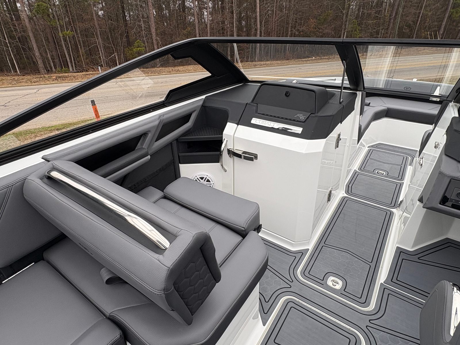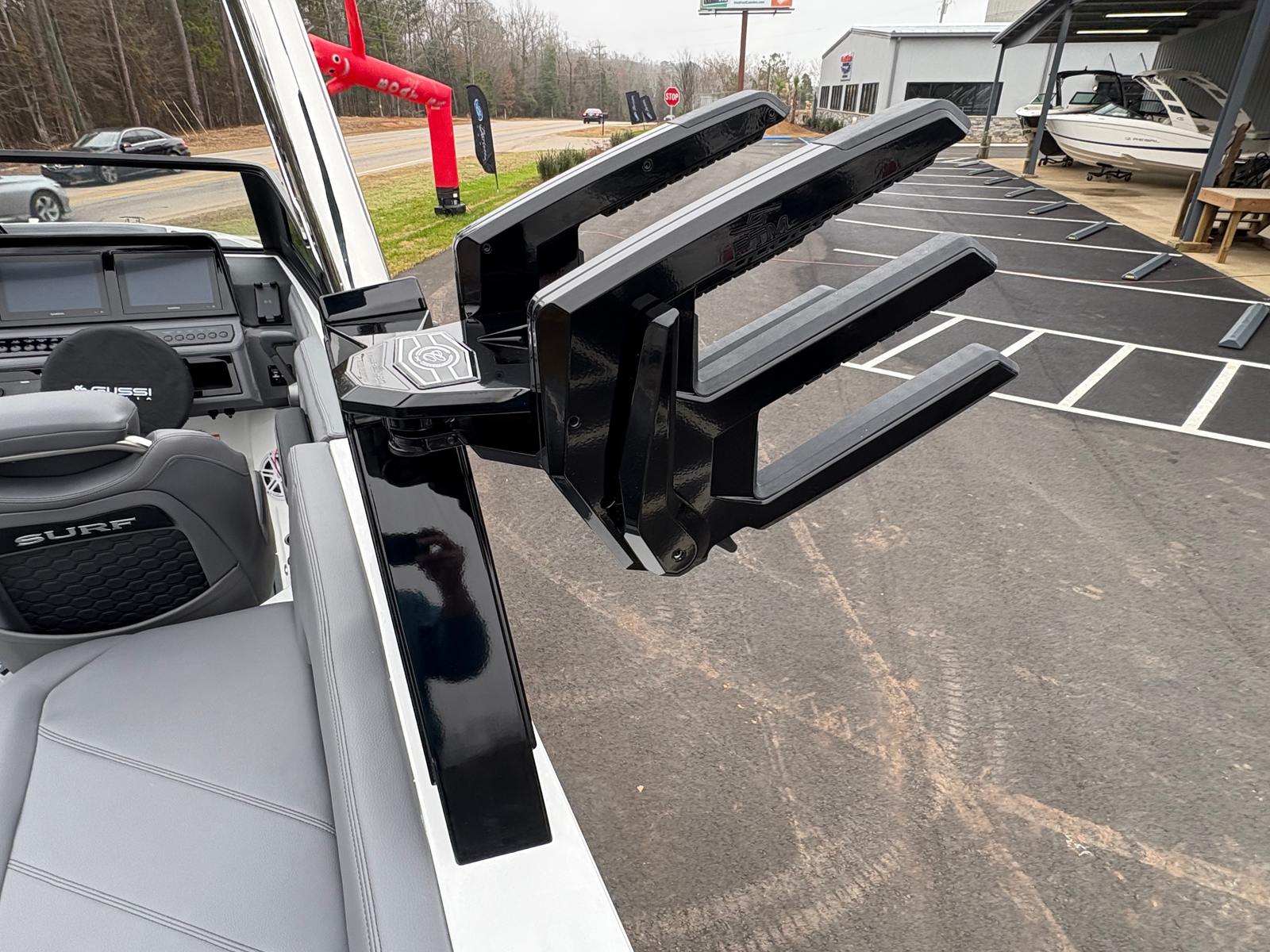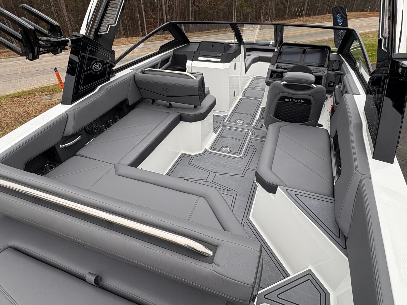The 2025 Cobalt R6 Surf is packed with premium features that set it apart from other Bowrider boats for sale. The Sof-Trac Mat (Helm Footrest) in Gray/Ebony provides added comfort for the captain, ensuring long days on the water remain enjoyable. The Surf Mid Hull Side in Rich Ebony and the Hull Bottom in Graphite Gray give the boat a sophisticated, modern look that turns heads at every marina.Docking is made easier and safer with stainless steel docking lights, while the white swim platform extension offers extra space for lounging, swimming, or gearing up for watersports. Fender clips with line simplify the process of securing your boat, adding convenience and peace of mind. The LED interior accent lighting creates a vibrant atmosphere for evening cruises, enhancing the overall onboard experience.One of the standout features is the electric arch, Prisma, in black, which folds down for easy storage and transport. Paired with the Ebony Bimini, this arch provides shade and style, making every outing more comfortable. Wakeboard racks with PTM Clampforce 3.0 in black offer secure storage for your gear, while the Roswell rearview mirror with a custom cover ensures optimal visibility for watersports enthusiasts.