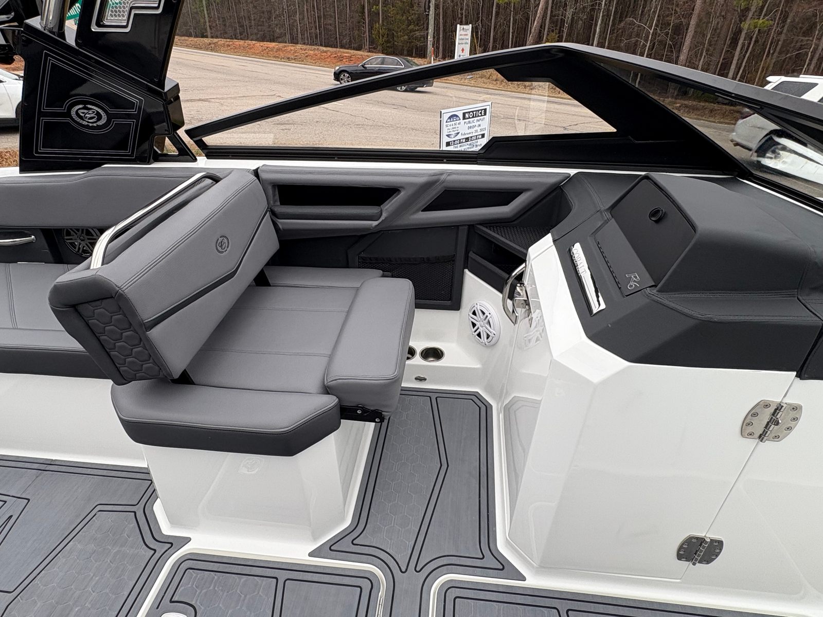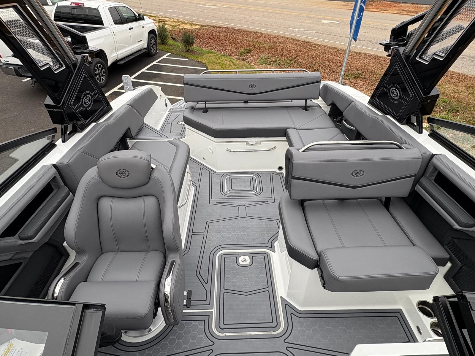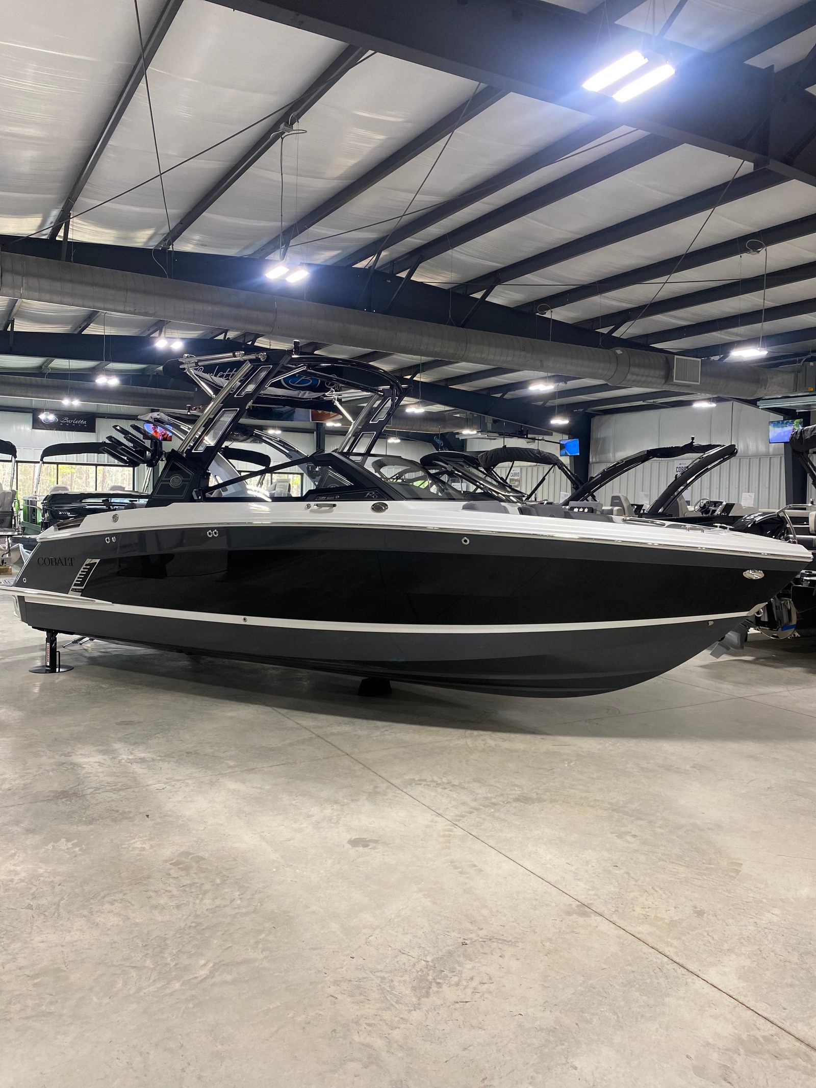 The 2025 Cobalt R6 Surf is packed with premium features that set it apart from other Bowrider boats for sale. The Sof-Trac Mat (Helm Footrest) in Gray/Ebony provides added comfort for the captain, ensuring long days on the water remain enjoyable. The Surf Mid Hull Side in Rich Ebony and the Hull Bottom in Graphite Gray give the boat a sophisticated, modern look that turns heads at every marina.Docking is made easier and safer with stainless steel docking lights, while the white swim platform extension offers extra space for lounging, swimming, or gearing up for watersports. Fender clips with line simplify the process of securing your boat, adding convenience and peace of mind. The LED interior accent lighting creates a vibrant atmosphere for evening cruises, enhancing the overall onboard experience.One of the standout features is the electric arch, Prisma, in black, which folds down for easy storage and transport. Paired with the Ebony Bimini, this arch provides shade and style, making every outing more comfortable. Wakeboard racks with PTM Clampforce 3.0 in black offer secure storage for your gear, while the Roswell rearview mirror with a custom cover ensures optimal visibility for watersports enthusiasts.