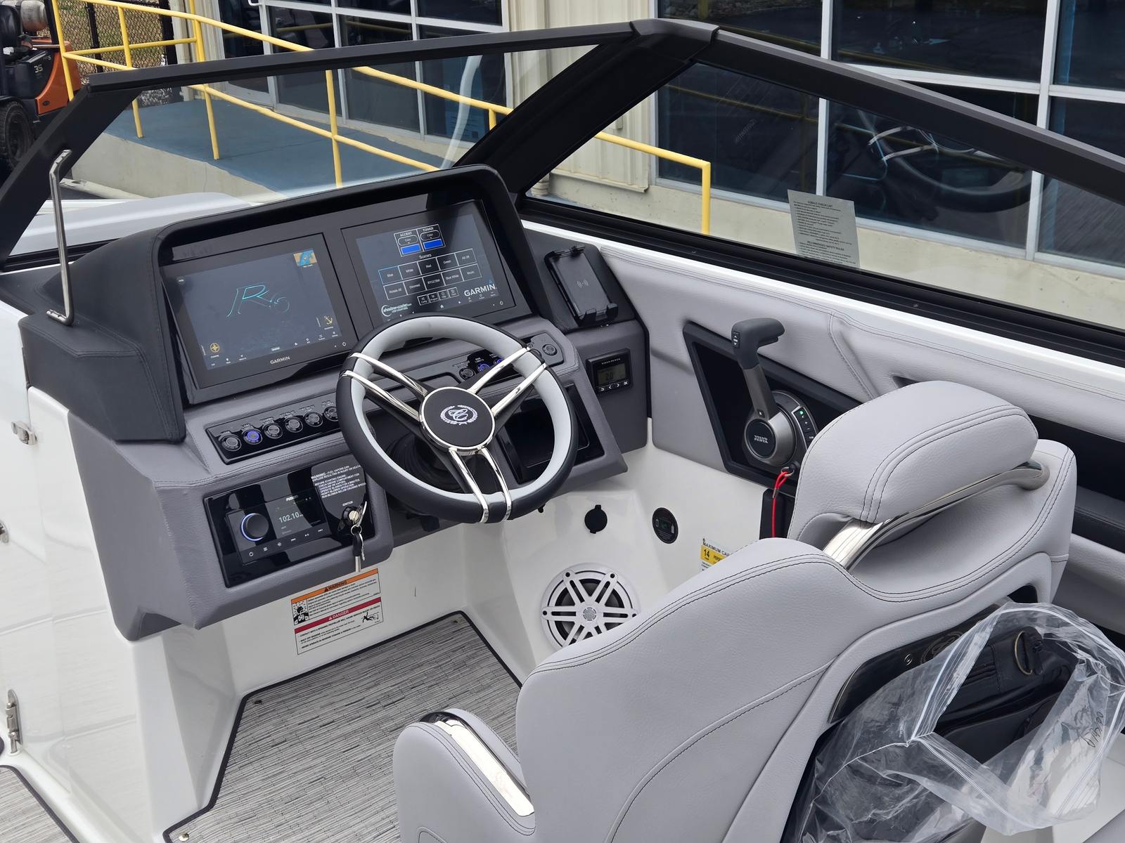 The 2026 Cobalt R6 is loaded with special features that enhance both comfort and convenience. The stylish Arch with Bimini provides shade and protection from the sun, allowing you to enjoy long days on the water in comfort. The integrated battery charger ensures your boat is always ready for action, while the distinctive Cobalt Letters in White Satin add a touch of elegance to the exterior.Docking is made effortless with stainless steel docking lights, offering enhanced visibility and safety during low-light conditions. Step aboard and you’ll be greeted by the plush Floor Covering in Seagrass—Silver Ash, which is both luxurious underfoot and easy to maintain. The Interior in Frost/Slate creates a modern, inviting atmosphere, complemented by the upgraded Leather Steering Wheel in Black/Gray for a premium driving experience.The R6’s Glass Cockpit with Dual Garmin displays puts advanced navigation and system controls at your fingertips, ensuring you stay informed and in command at all times. The striking hull colors—Rich Ebony on the bottom and Deep Teal on the sides—give this Bowrider a distinctive, upscale look that stands out on any waterway.
