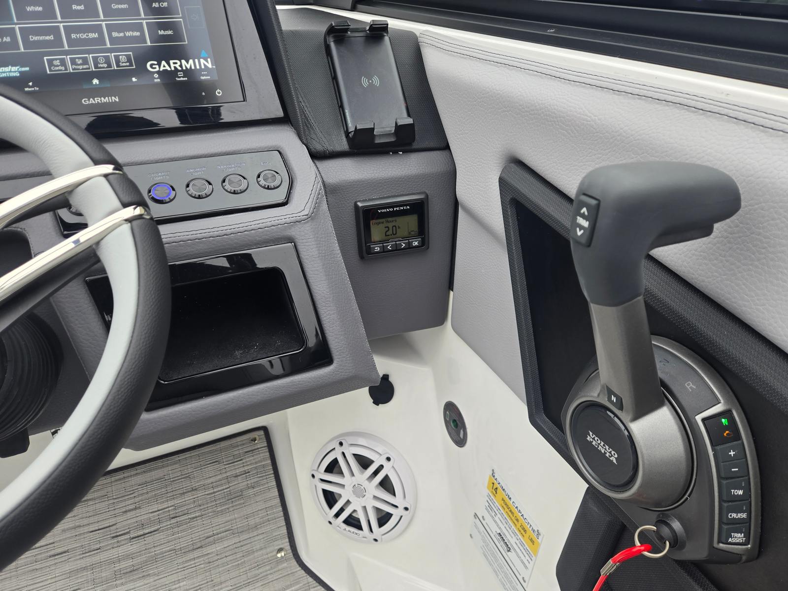 The Cobalt R6 is designed with real-world usability in mind. The generous length and smart layout provide ample storage for gear, water toys, and personal items, keeping the deck clutter-free and organized. The stainless steel docking lights make it easy to approach docks and slips, even in low-light conditions, while the battery charger ensures your systems are always powered up and ready to go.The durable Seagrass floor covering is both attractive and practical, standing up to wet feet and active days on the water. The Bimini top offers quick, adjustable shade, so you can adapt to changing weather and keep everyone comfortable. With its user-friendly controls and advanced Garmin displays, the R6 is as easy to dock and maneuver as it is fun to drive.
