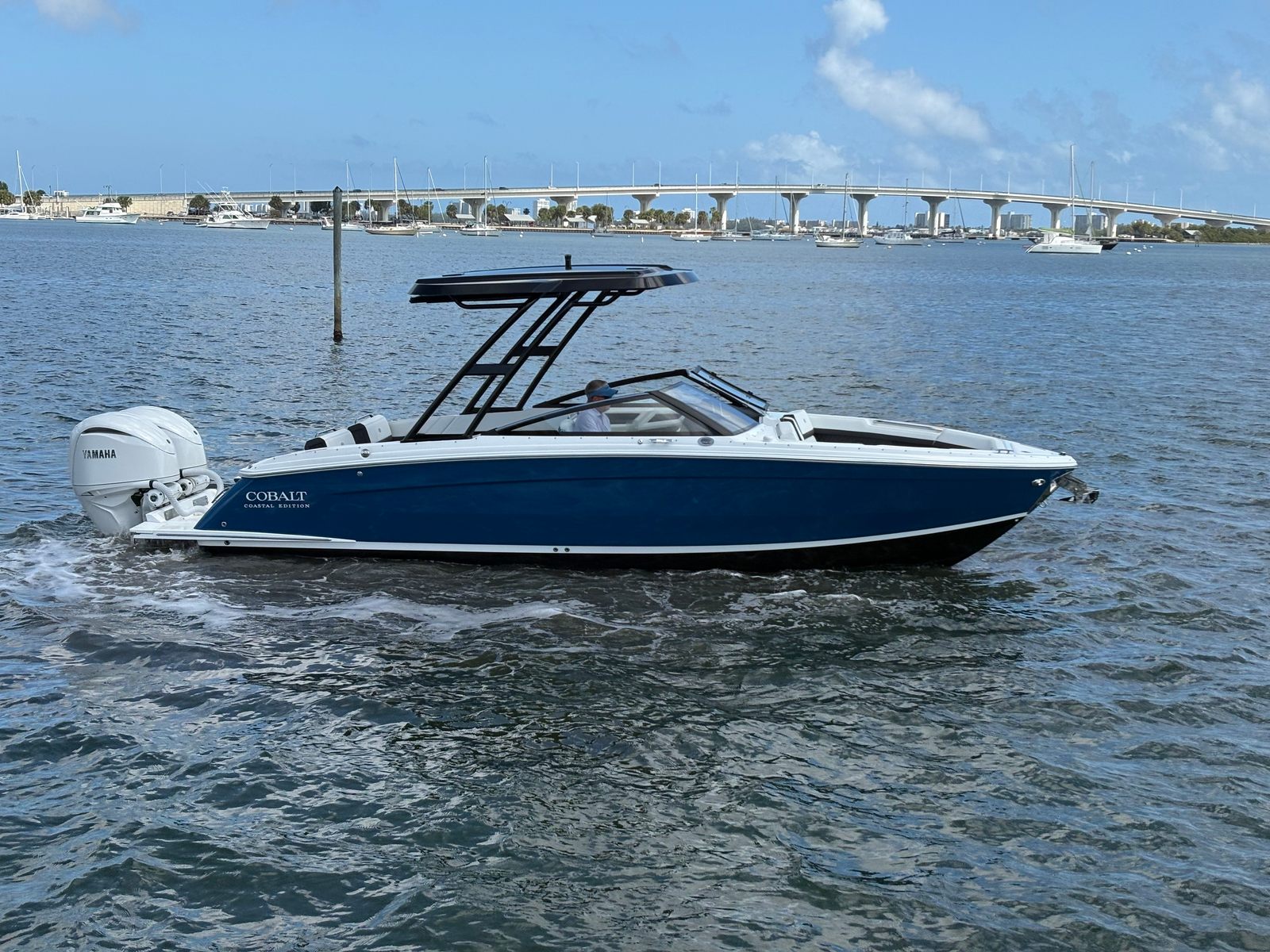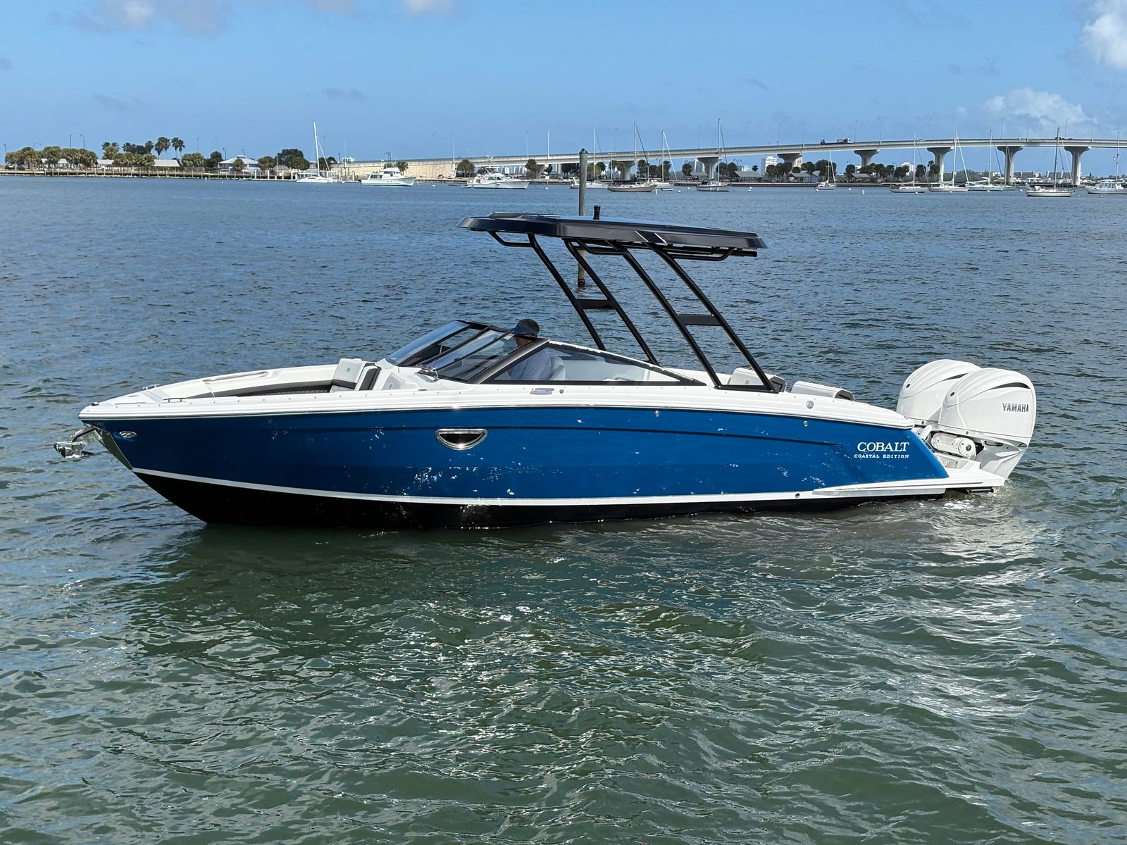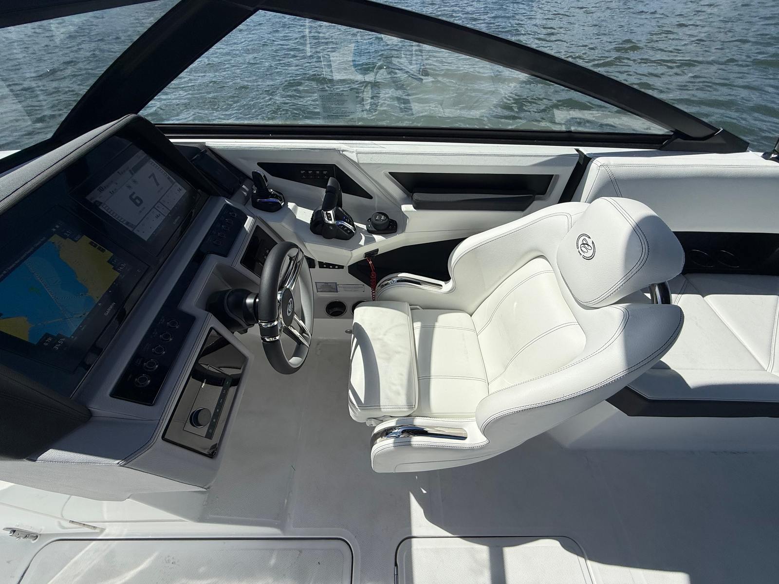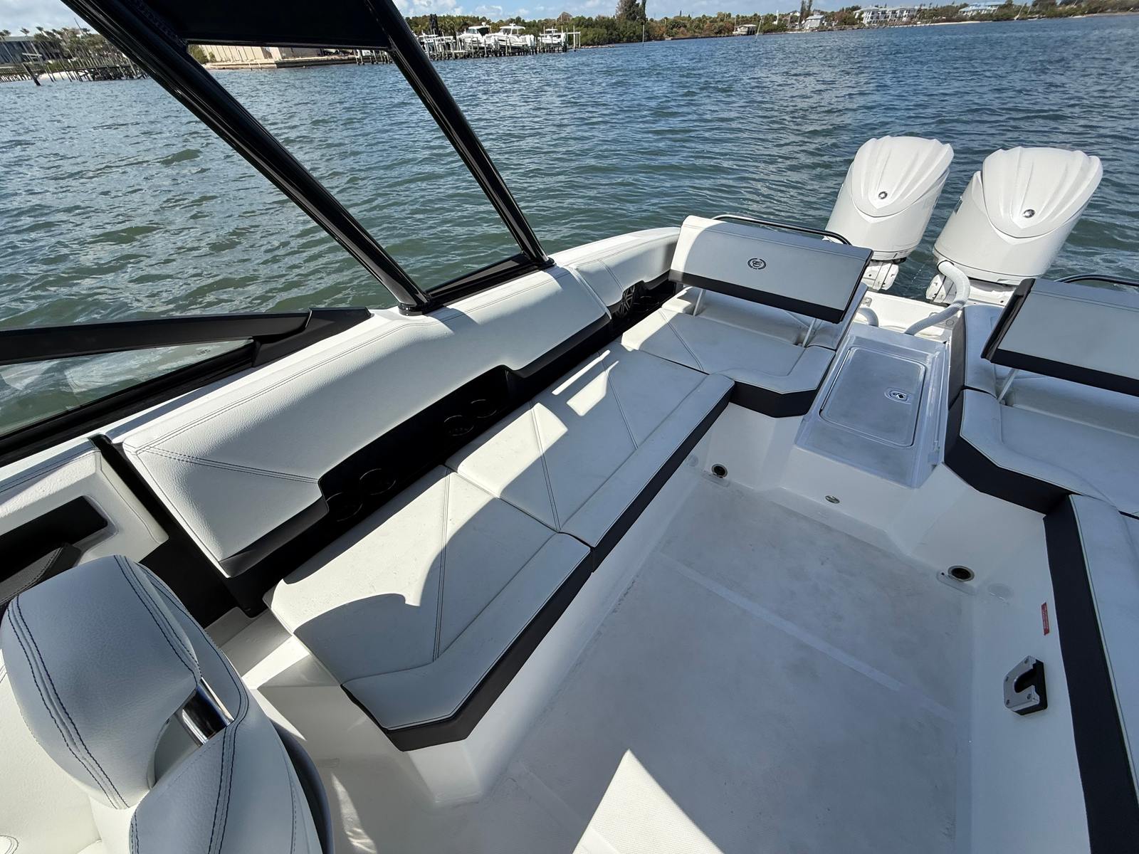 The Cobalt R8 OB is packed with premium features that elevate your boating experience. The battery charger ensures your boat is always ready for action, while the board ladder on the port side makes it easy to get in and out of the water after swimming or water sports. The bow tonneau cover in elegant ebony protects your boat’s interior from the elements, and the Cobalt letters in white satin add a touch of sophistication to its striking profile.For those who love to entertain, the dinette table in solid teal with a cockpit receptacle provides a stylish and functional space for snacks, drinks, or games. Stainless steel docking lights enhance visibility and safety during evening outings, while the electric adjustable seat offers personalized comfort for the captain or guests. The engine flush system by Reverso for twins helps maintain your engines in peak condition, ensuring longevity and optimal performance. A flagpole with a flag adds a classic nautical touch, making your Cobalt R8 OB stand out wherever you go.