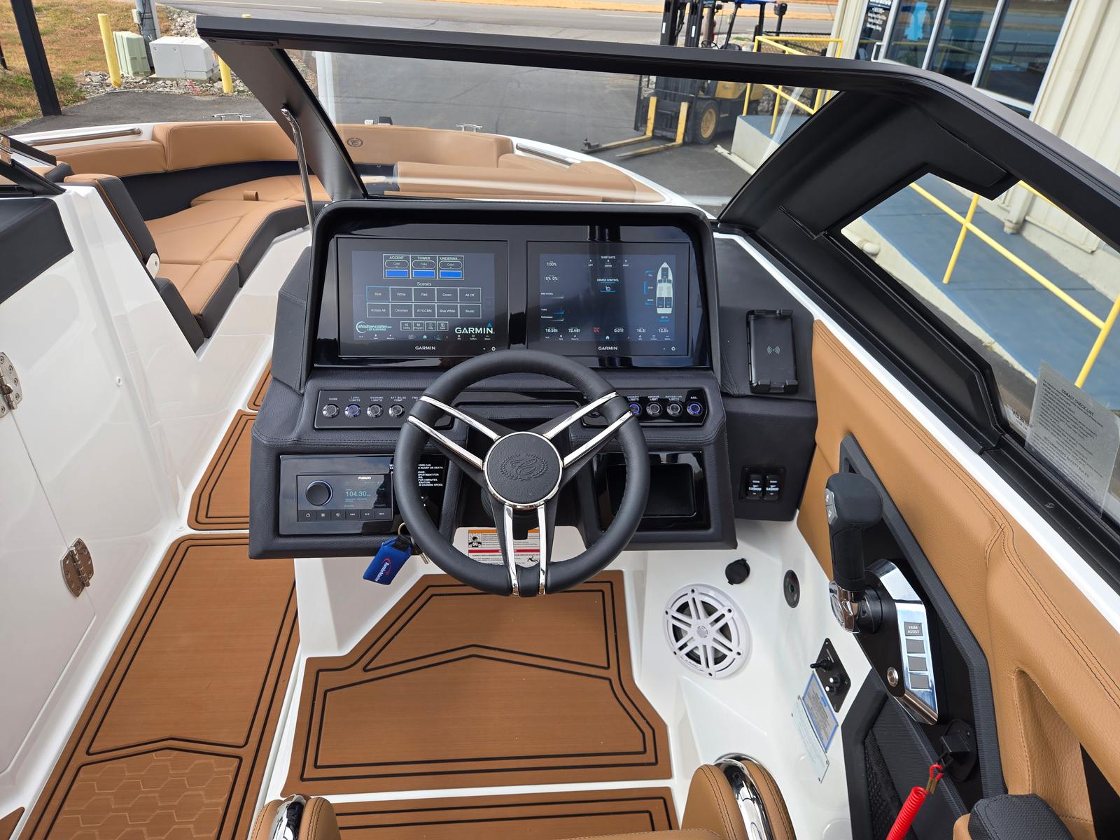 Practicality meets luxury in the Cobalt R8 Surf. The folding Prisma arch with Ebony Bimini makes it easy to navigate under bridges or store your boat in tighter spaces, while still providing ample shade when needed. The mooring cover protects your boat from the elements, preserving its beauty and value over time. Stainless steel docking lights make evening arrivals and departures safer and more convenient, and the battery maintainer/charger ensures your boat is always ready to go.The dual Garmin 8610 displays in the glass cockpit provide intuitive navigation and system monitoring, making it simple to plan routes, track performance, and stay informed on the water. The spacious layout offers plenty of room for gear, coolers, and water toys, making it easy to prepare for a day of fun. The combination of luxury, convenience, and performance makes the R8 Surf a practical choice for boaters who demand the best.