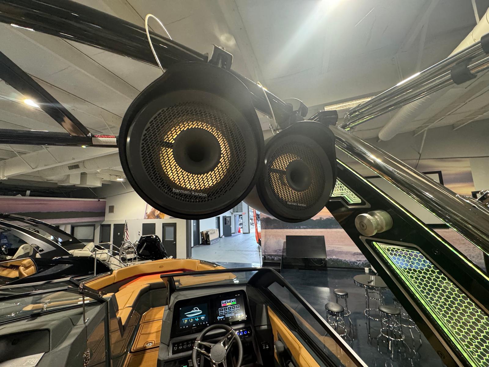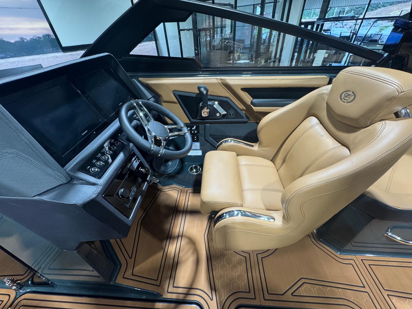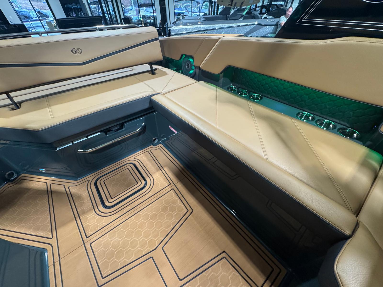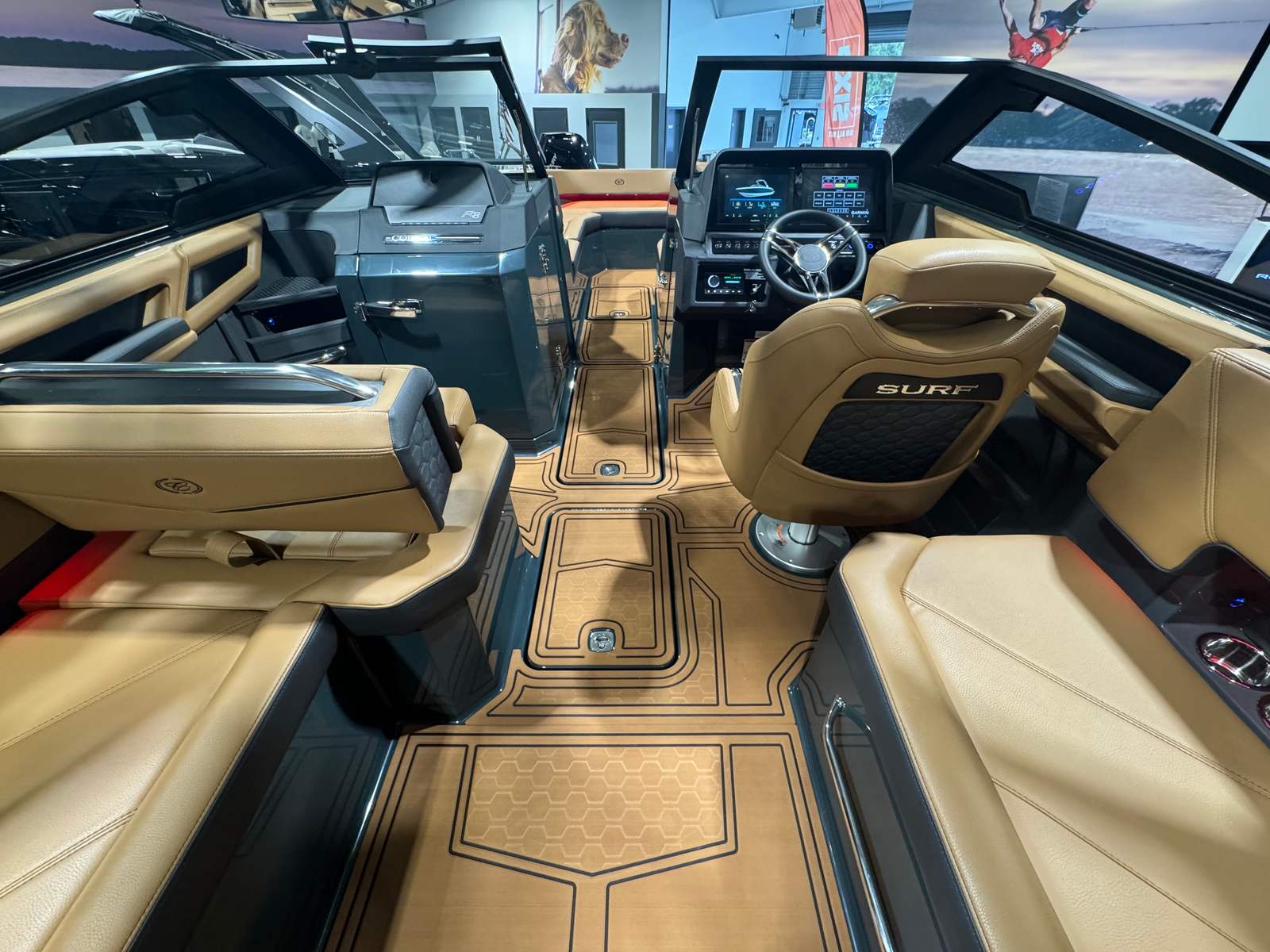 The 2026 Cobalt R8 Surf Bowrider is packed with premium features designed to enhance your boating experience. The interior boasts a sophisticated palette of Caramel, Carbon, and Ebony, creating a warm and inviting atmosphere for passengers. Cobalt Letters in Black Satin add a touch of elegance to the boat’s exterior, while stainless steel docking lights provide both style and safety during evening excursions.A standout feature is the electric arch, Prisma - Black (Folding) with Ebony Bimini, which offers shade and protection from the sun while maintaining the boat’s sleek silhouette. The electric adjustable seat ensures optimal comfort for the captain, allowing for personalized positioning during long journeys. The rear-facing camera adds an extra layer of safety and convenience, making it easier to monitor activities behind the boat, especially during water sports.Additional features include a battery maintainer/charger (110V) to keep your boat powered and ready for action, a flagpole with flag for added flair, and a full-colored deck in Deep Teal that sets the R8 Surf apart from the crowd.