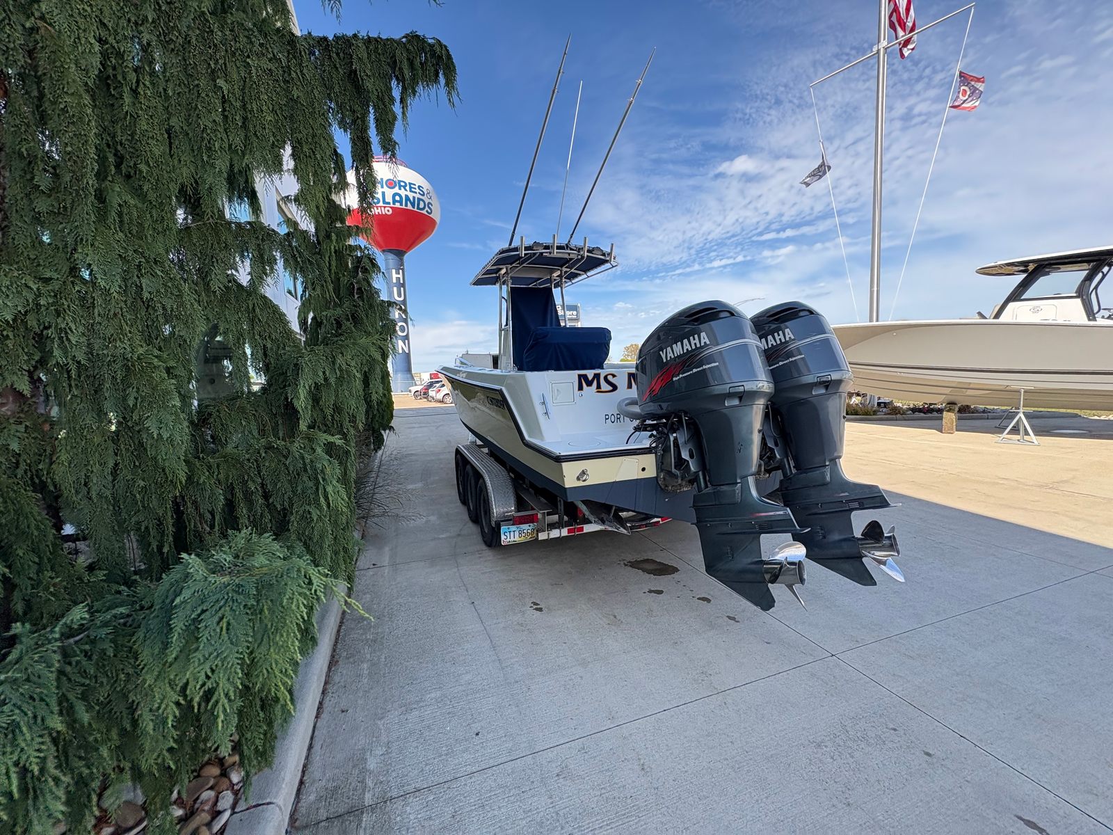 Practicality is a hallmark of the Contender 27 Cuddy. The boat’s manageable size makes it easy to dock, trailer, and store, while the efficient twin-engine setup helps optimize fuel consumption without sacrificing performance. Cockpit storage compartments keep your gear organized and out of the way, reducing clutter and enhancing safety. The fish box is ideal for storing your catch or keeping refreshments chilled, adding to the boat’s versatility. The blue canvas not only adds a touch of style but also offers protection from sun and rain, extending your comfort during long days on the water. The four-year-old batteries ensure that all electrical systems, from navigation to entertainment, operate reliably, so you can focus on enjoying your time aboard. The helm stereo controls make it easy to adjust music and set the mood, whether you are cruising at sunset or anchored in your favorite cove.