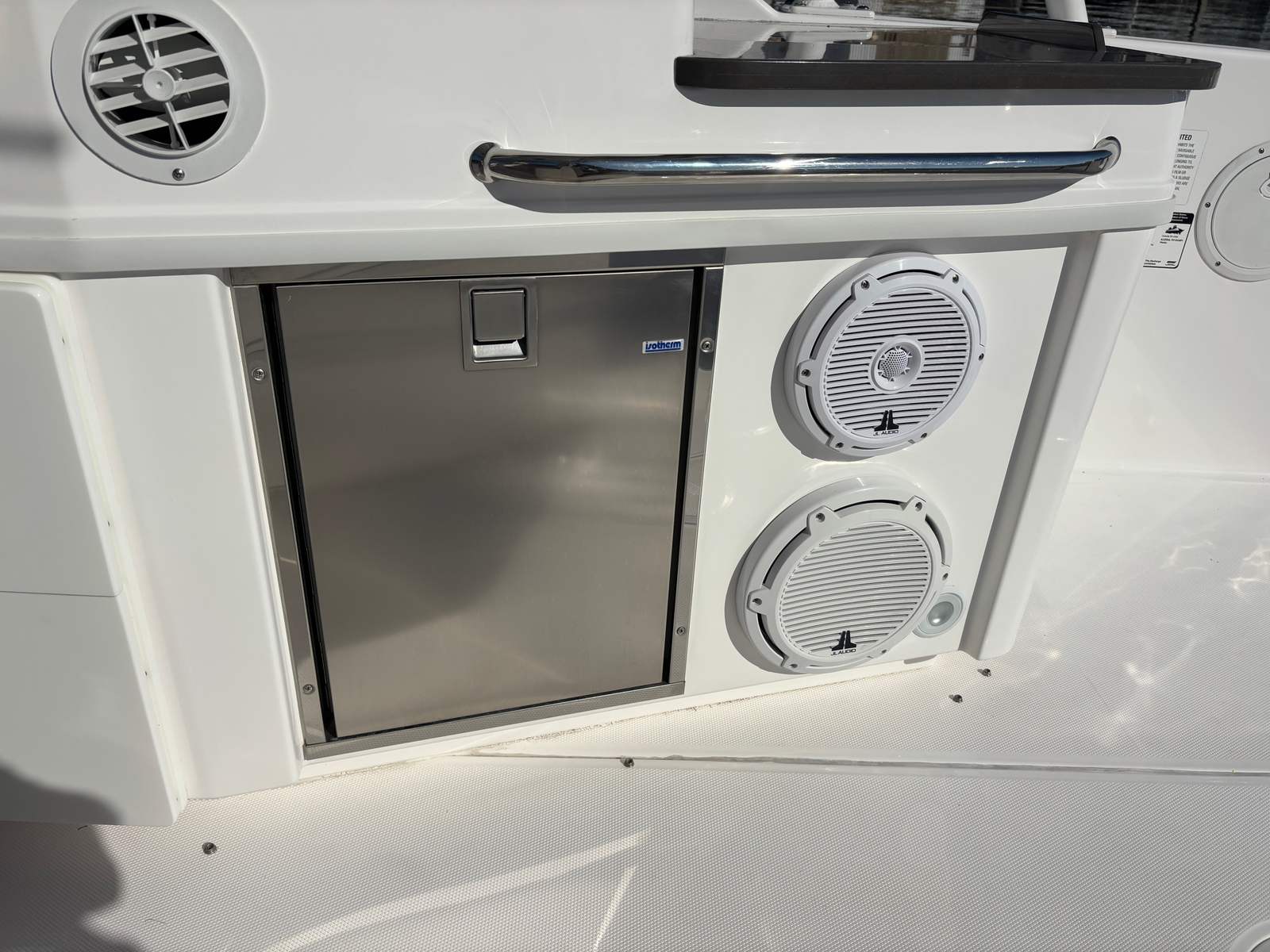 •Bow lounge with built in insulated cooler and removable table •Walk through transom door
