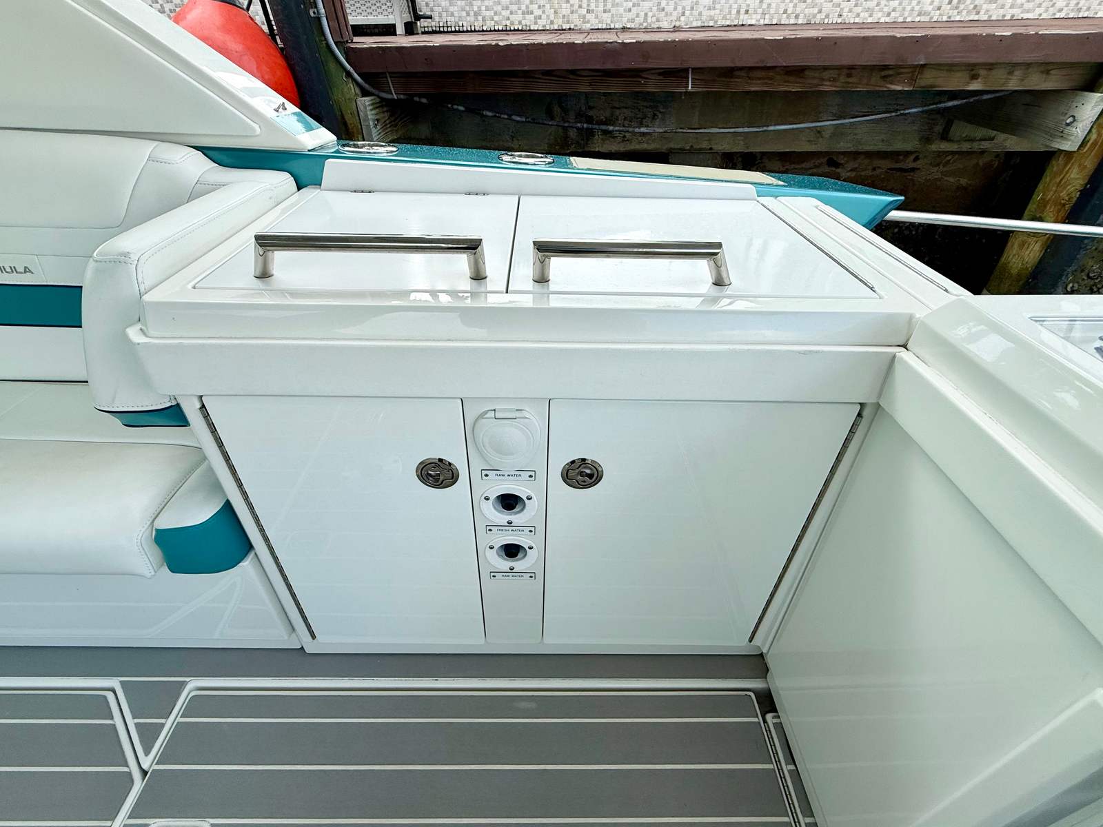 Woodgrain vinyl decking on swim platform and throughout the cockpit
