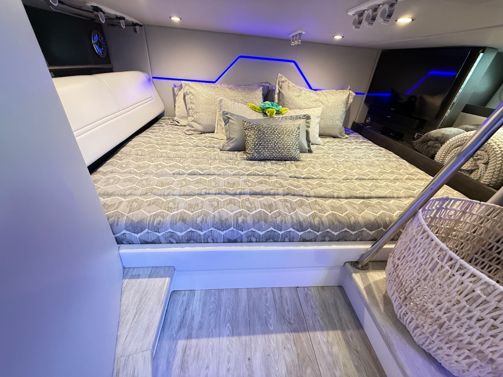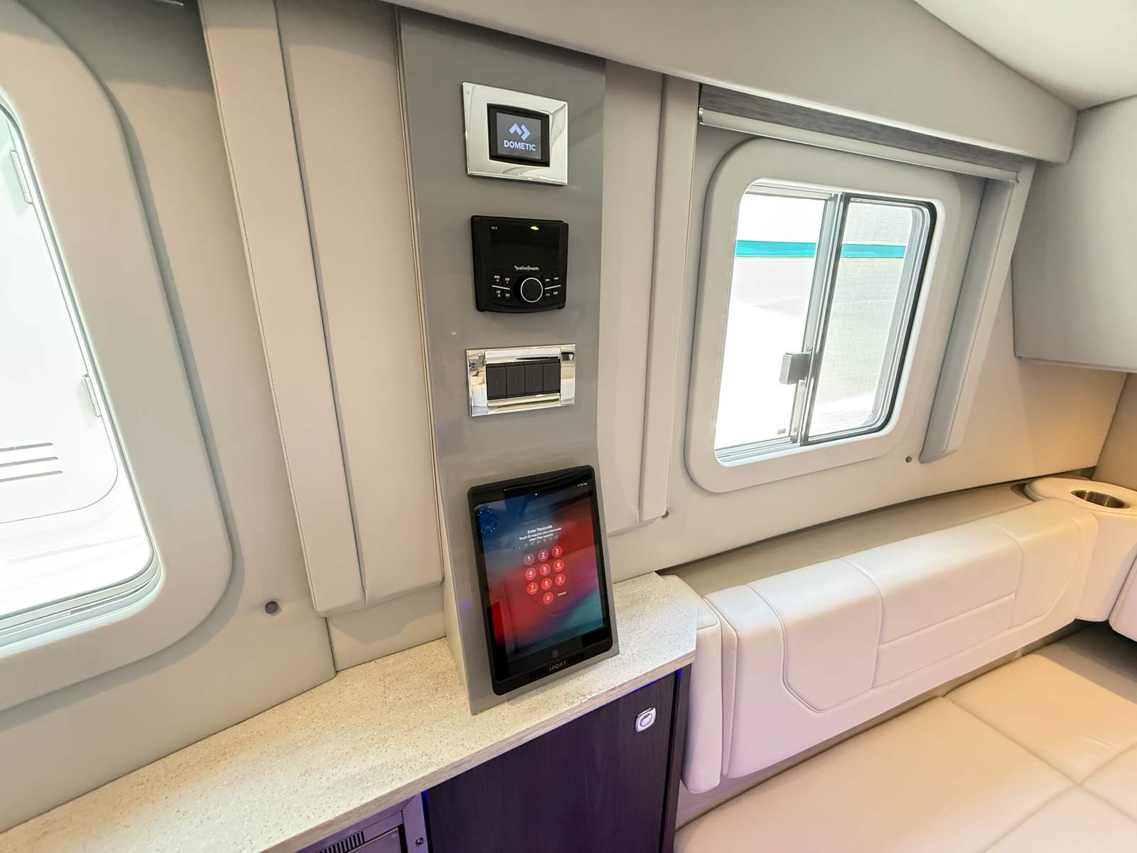 Rockford Fosgate stereo with Bluetooth connectivity, dash-mounted stereo control head with full color display, USB & MP3 ports, remote controller at the bow area, JL Audio M6 blue LED lighted speakers (six hardtop, four cockpit), 1000W stereo amplification and two 200W subwoofers