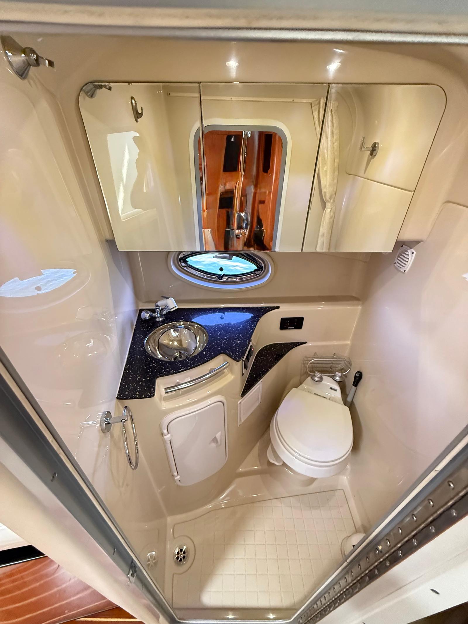 Designed for easy entertaining and comfortable cruising, the cockpit features a spacious U-shaped seating area, full SeaDeck flooring, and a center walk-through to the bow. A full camper canvas with isinglass enclosure and a cockpit cover provide flexibility and protection in any weather.