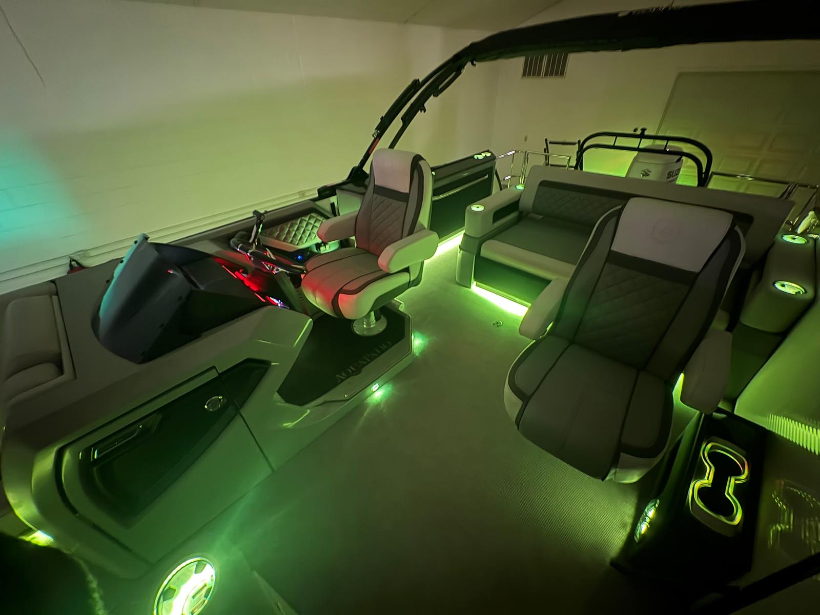 The Godfrey Aqua Patio 235 Sflc comes equipped with a host of special features that set it apart from other pontoon boats for sale. Enjoy the convenience of a FULL MOORING COVER, which helps protect your investment and keeps your boat looking pristine. The POWER BIMINI TOP offers effortless shade and shelter, allowing you to relax in comfort no matter the weather. The TRANSOM RAIL SYSTEM adds safety and versatility, while DOCKING LIGHTS make evening arrivals and departures a breeze.For those who love water activities, the FOLDING SWIM LADDER and SKI TOW BAR make it easy to dive in or enjoy exhilarating water sports. The UNDERWATER LIGHTS and RGB UNDERDECK LIGHTS create a captivating ambiance for nighttime cruises, while the RGB INTERIOR LIGHTING lets you set the mood for any occasion. The stainless steel prop not only boosts performance but also adds a touch of sophistication to the boat’s overall design.