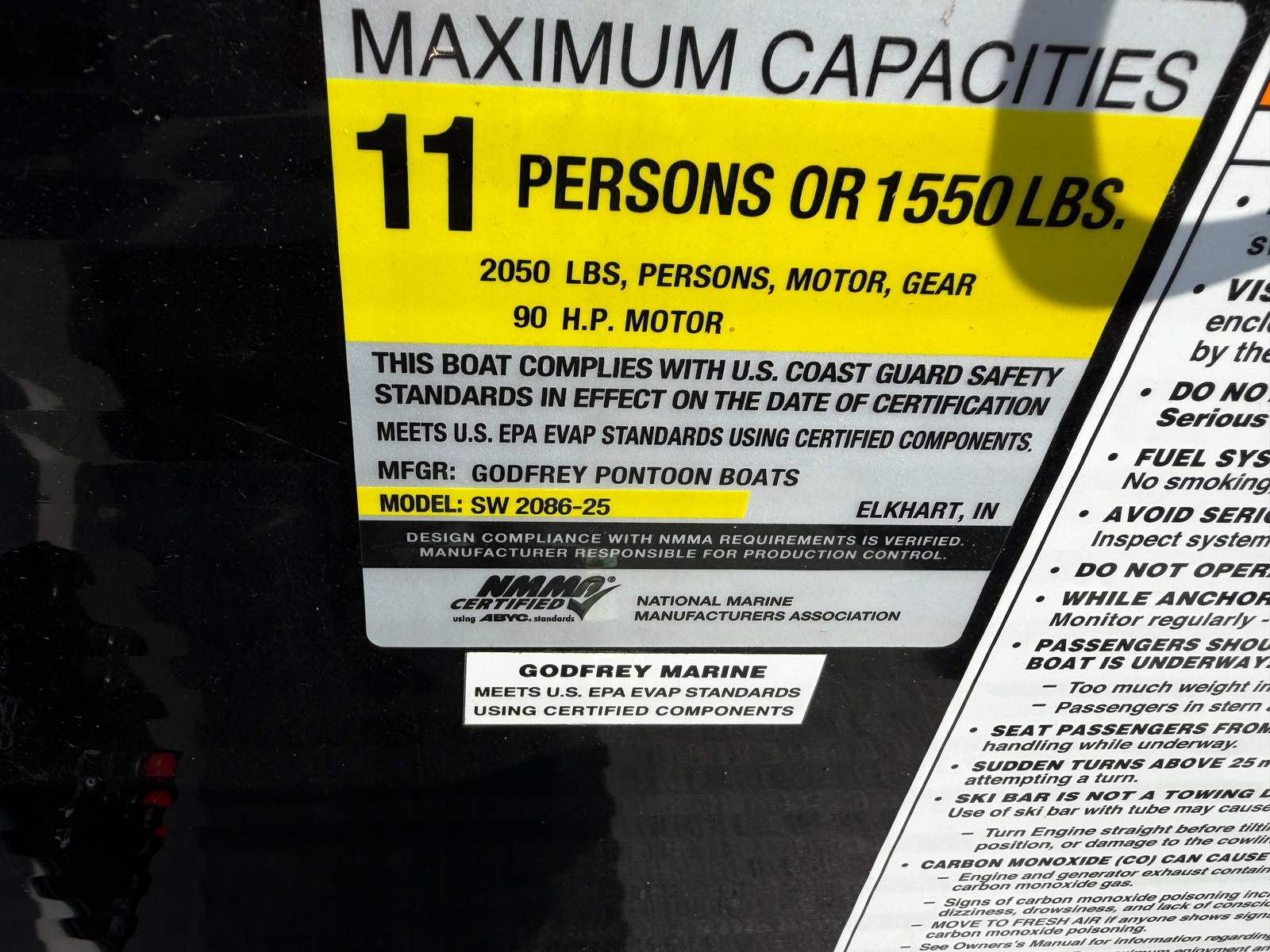 In summary, the 2023 Godfrey SW 2086 CX is a versatile and stylish pontoon boat that offers exceptional value for anyone seeking a used pontoon boat for sale. With its reliable 90 HP engine, low engine hours, and spacious design, this Godfrey boat for sale is ready to create lasting memories on the water. Whether you are looking for a family-friendly vessel, a platform for fishing adventures, or a comfortable cruiser for entertaining, the SW 2086 CX delivers on all fronts. Don’t miss your chance to own this outstanding pontoon—contact the dealer today to learn more and schedule your personal viewing. Your next adventure awaits with the Godfrey SW 2086 CX!