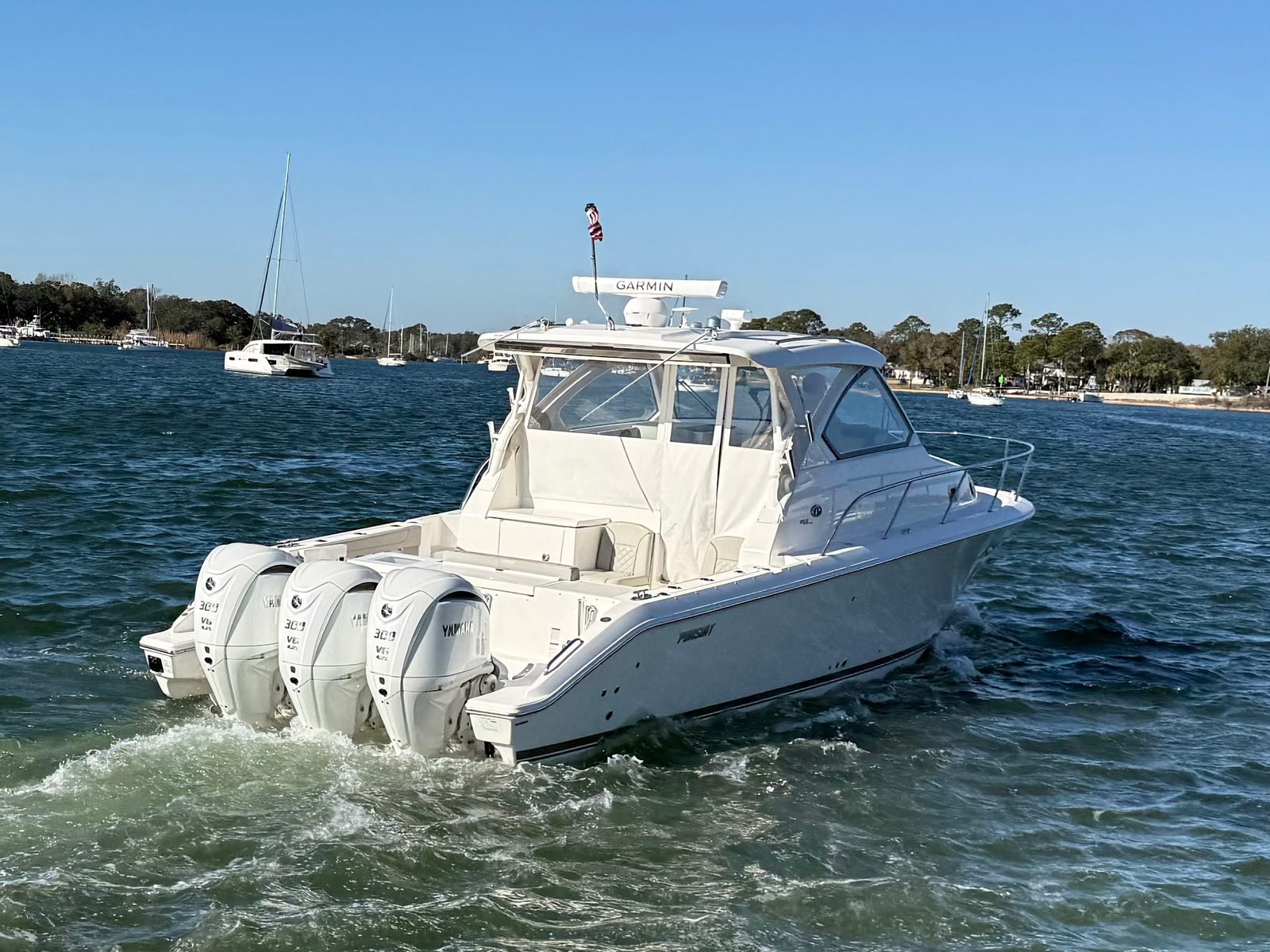 The Pursuit OS 355 Cruiser is designed with both functionality and luxury in mind. Its spacious layout allows for comfortable seating, generous deck space, and easy movement throughout the boat. The 37.92-foot length ensures that you have plenty of room for guests, gear, and activities, making it a versatile platform for everything from family outings to entertaining friends. Pursuit’s attention to detail is evident in the quality of materials, the thoughtful design of the cabin and cockpit, and the overall fit and finish of the boat.Special features of the Pursuit OS 355 include its triple-engine configuration, which not only enhances performance but also provides added reliability and safety. The engines’ combined 900 horsepower allows for swift acceleration and smooth cruising, while the low engine hours mean you can enjoy peace of mind knowing the boat is in excellent condition. The used status of this Pursuit boat for sale offers a fantastic opportunity to own a nearly new vessel at a competitive price, making it a smart investment for boating enthusiasts.