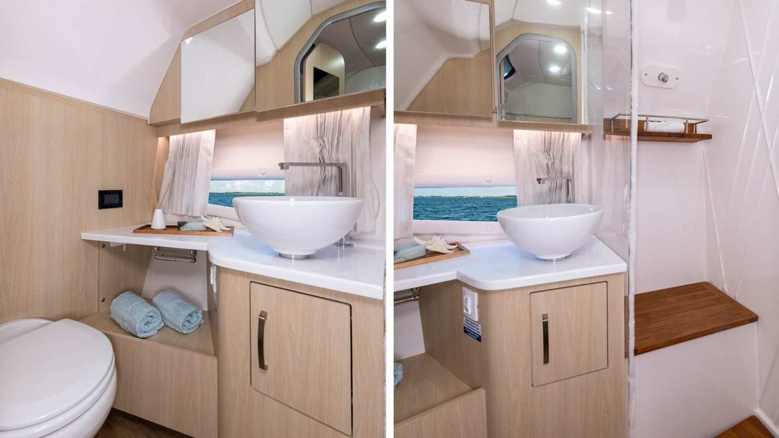Fresh water marine toilet in a HUGE walk-in head compartment, stall shower and abundant storage