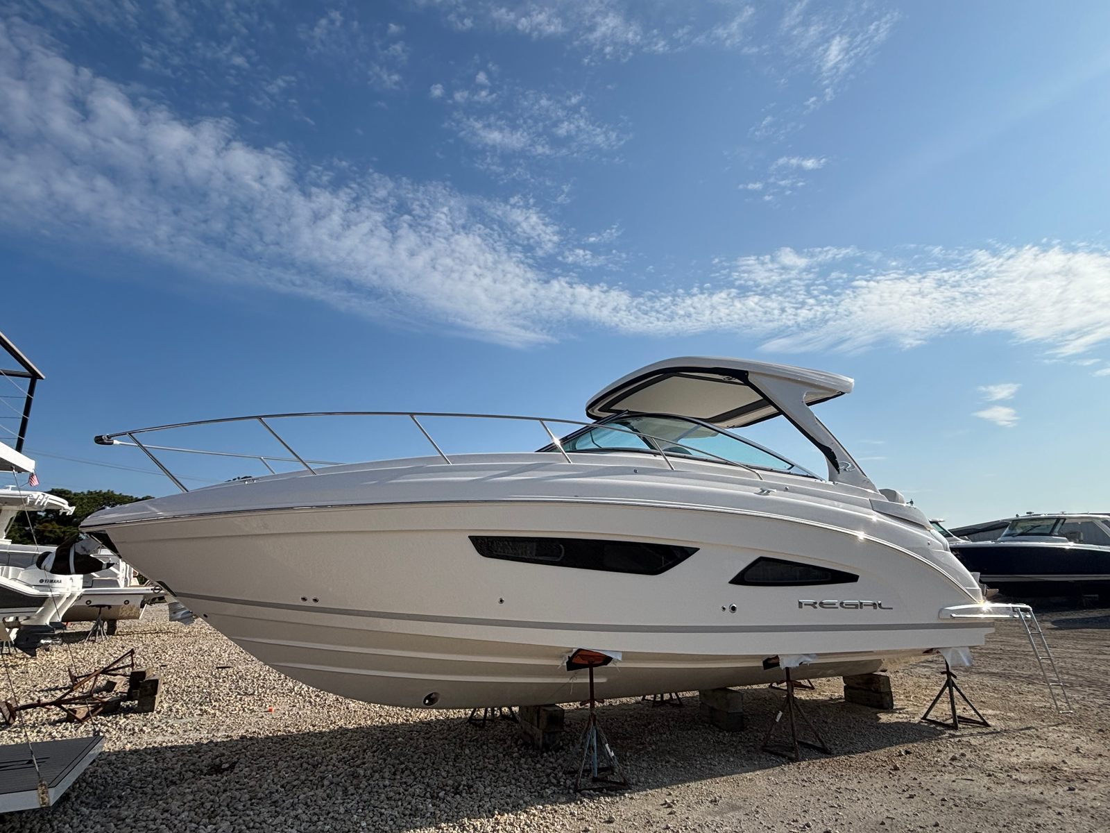 Beyond its luxurious features, the Regal 33 XO is designed with practicality in mind. The integrated steering system simplifies docking and close-quarters maneuvering, reducing stress and making every trip more enjoyable. The cockpit cover protects your investment from the elements, while the durable countertops and flooring are easy to maintain and clean. Storage solutions throughout the boat keep your gear organized and accessible, so you can focus on enjoying your time on the water. The efficient twin Yamaha engines offer a balance of power and fuel economy, allowing you to explore further without frequent stops for refueling.