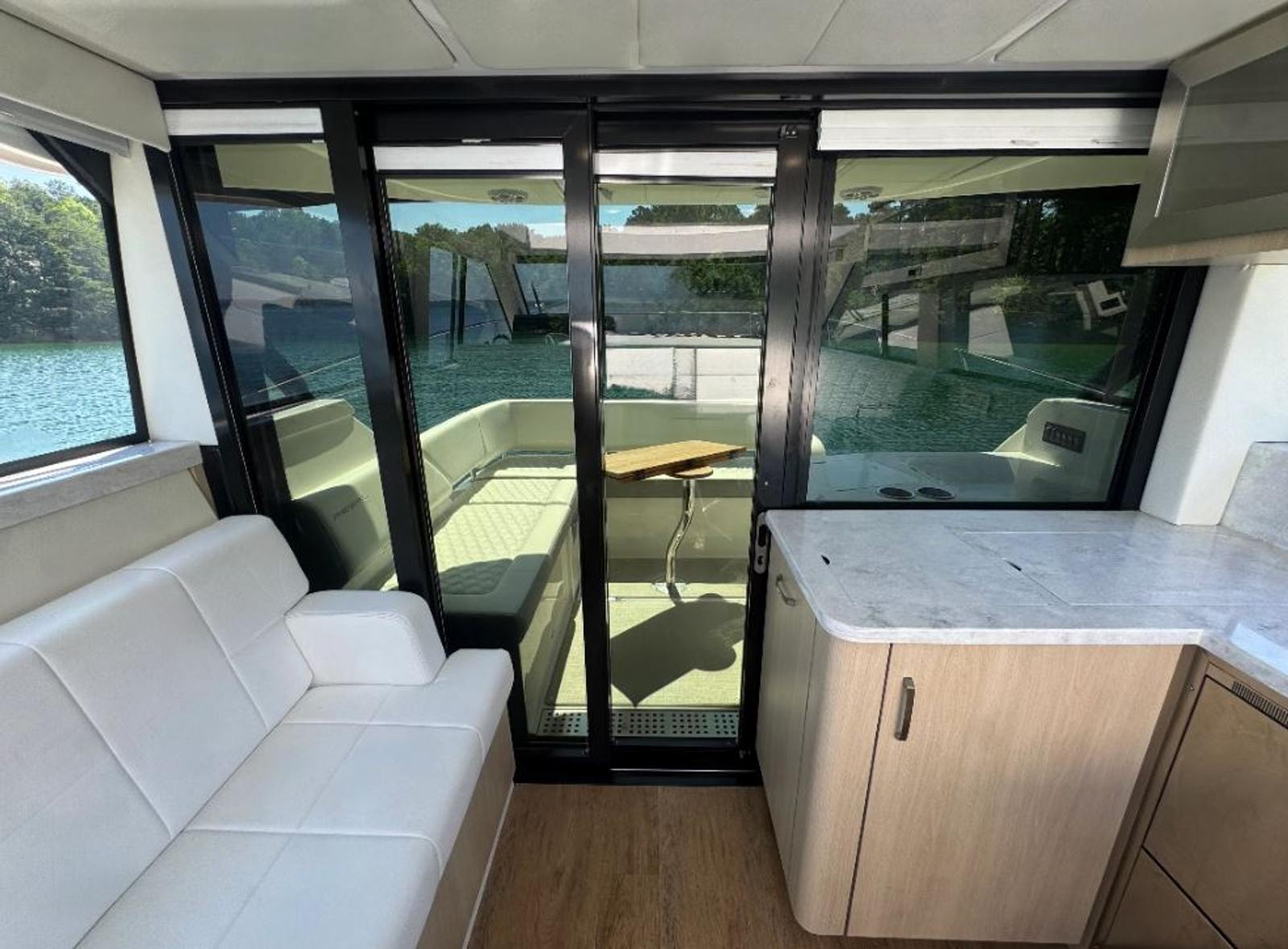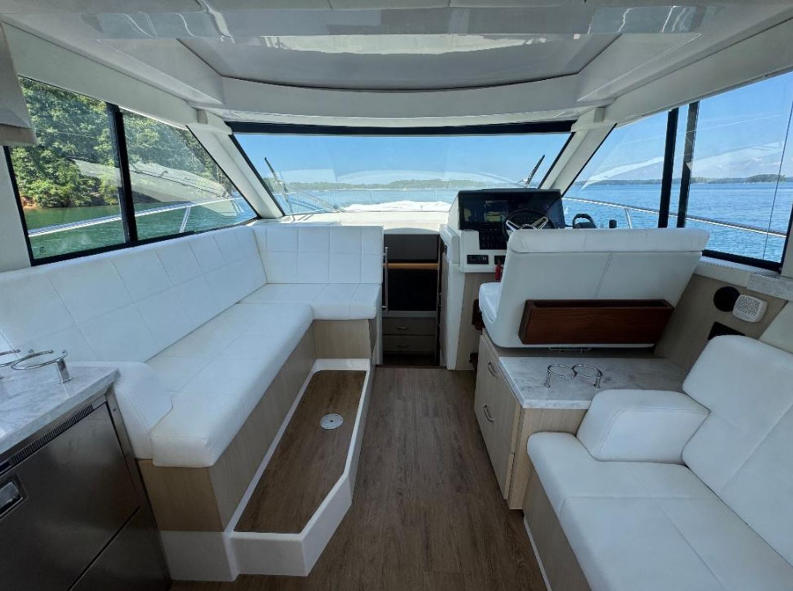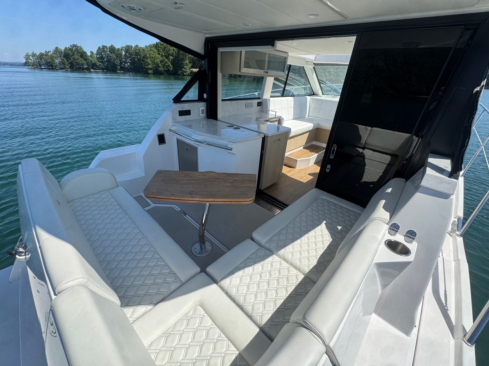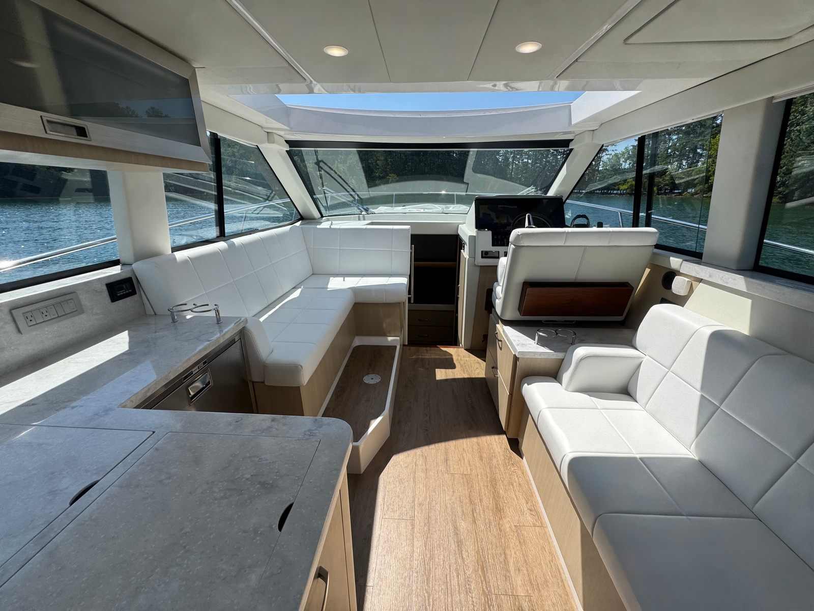 Professionally serviced by Singleton Marine, this 38 Grande Coupe is turn-key and loaded with premium features for both day cruising and extended stays aboard. The enclosed cockpit with Isinglass enclosure and electric sunroof provides year-round comfort, while the interior offers two private staterooms and a separate shower for a true home-away-from-home experience.