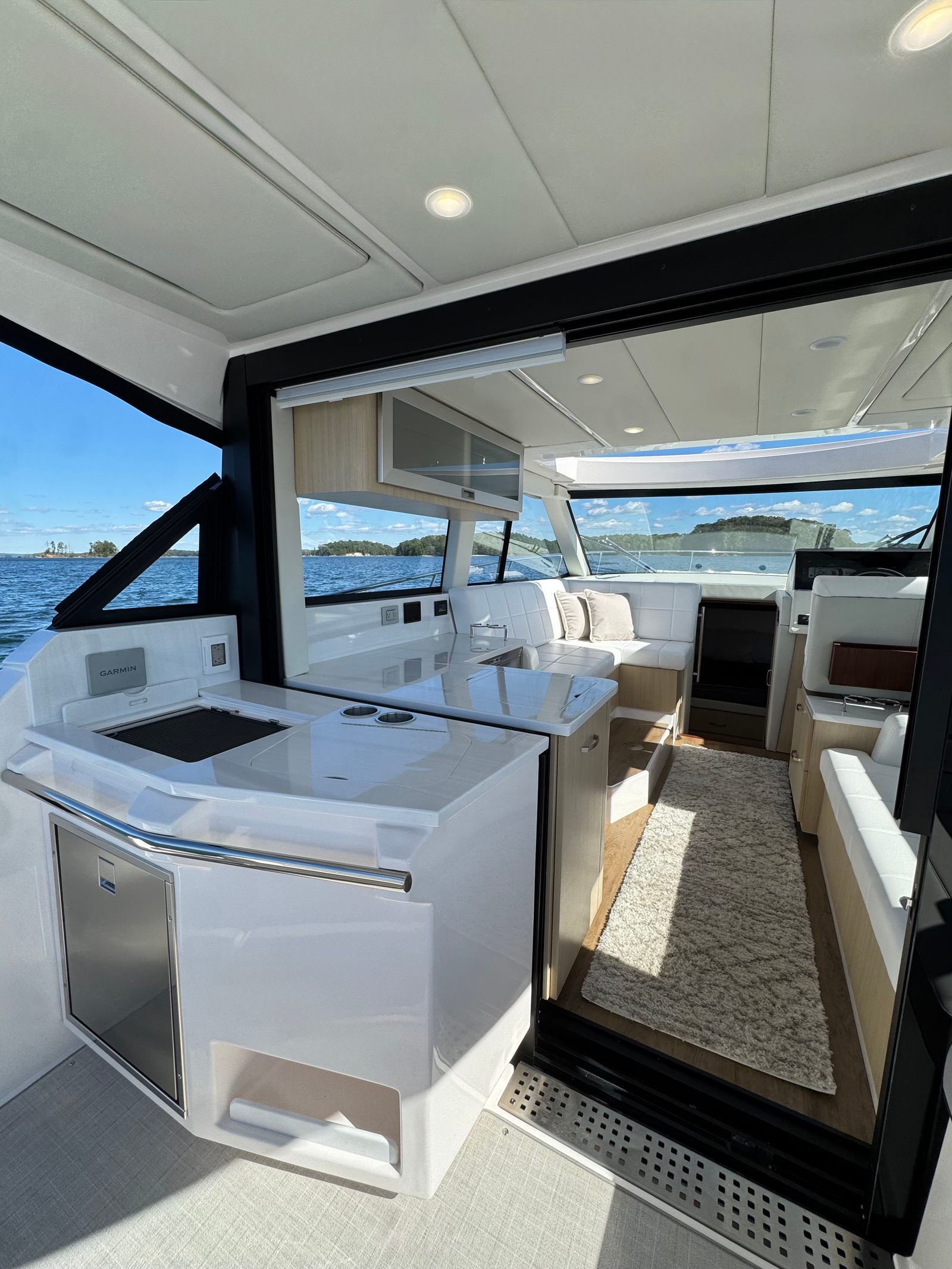 The galley, combined with the outdoor refreshment center, offers a versatile space perfect for meal prep and entertaining guests, making it easy to create the ideal dining experience on the water.