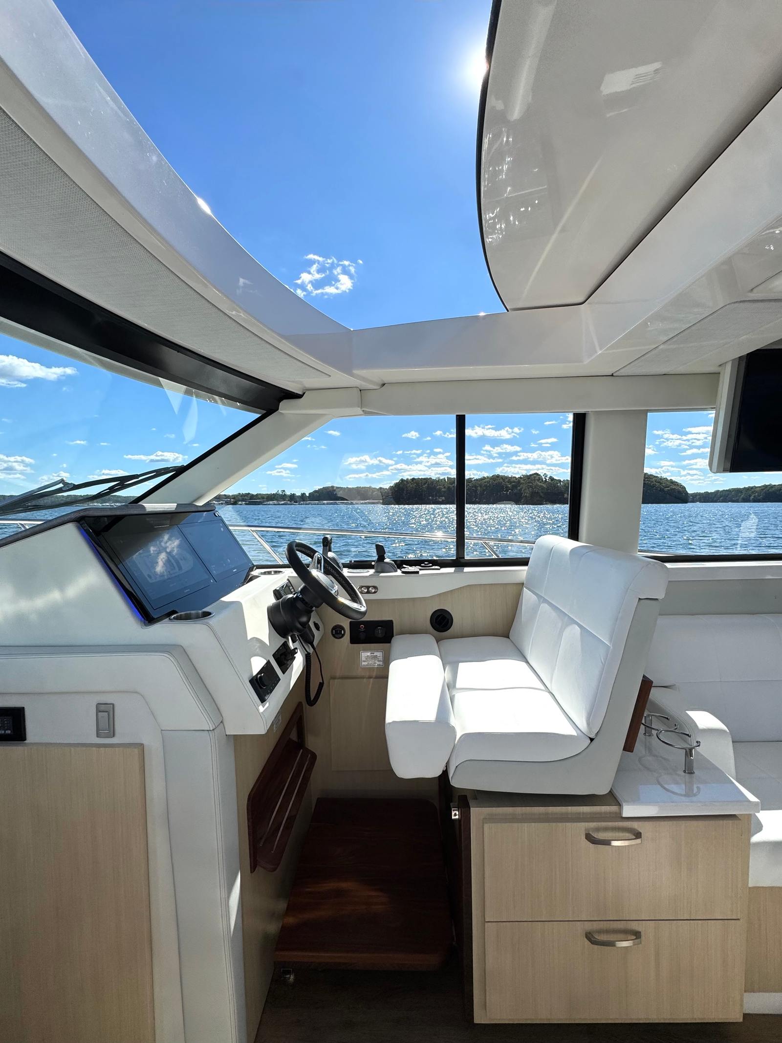 The vinyl-wrapped helm with hand-stitched accents exudes true luxury, while the dual 16” Garmin displays, joystick, and autopilot enhance the boating experience, ensuring ease of control and precision.