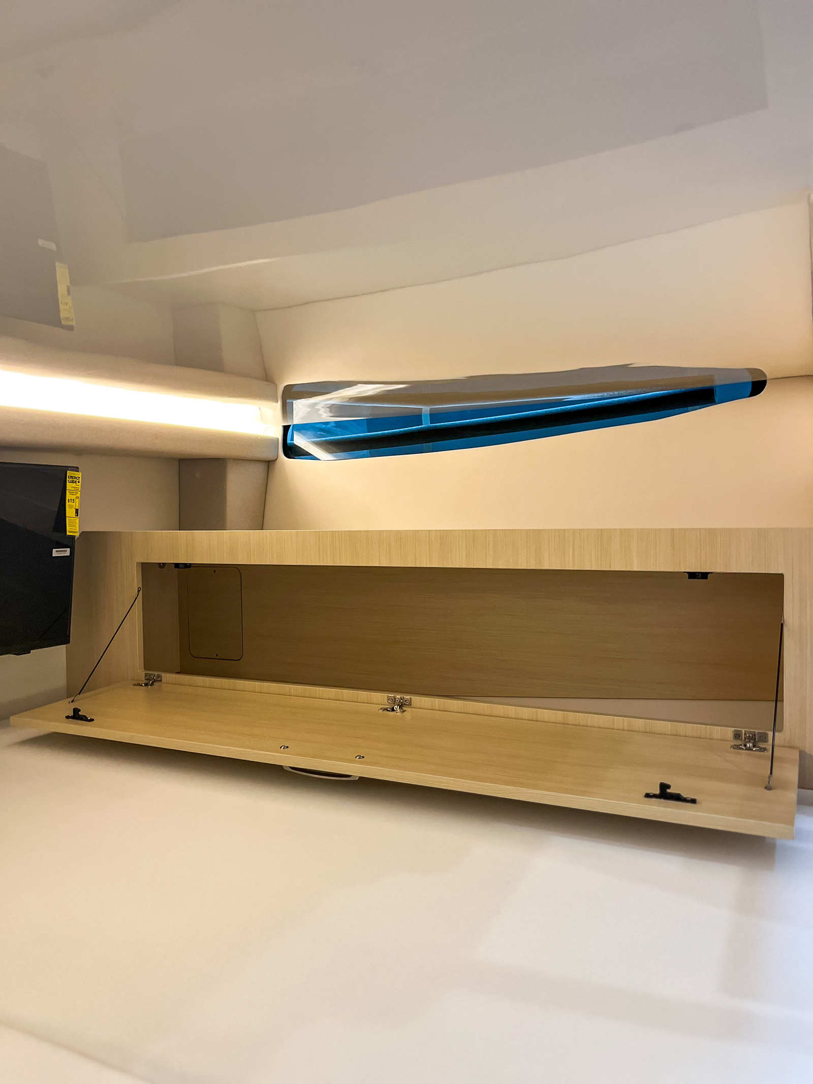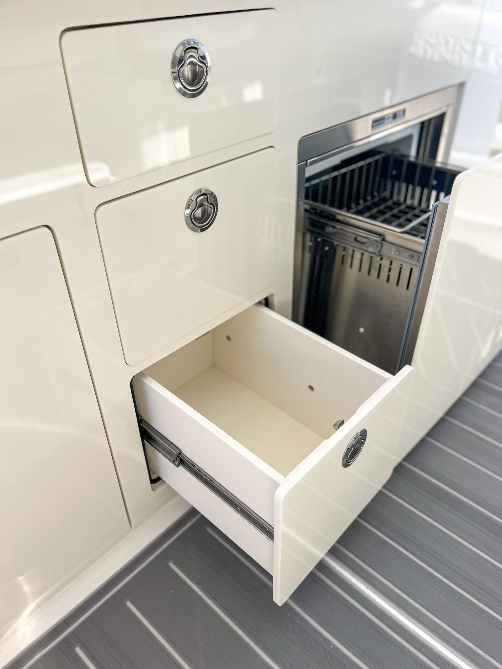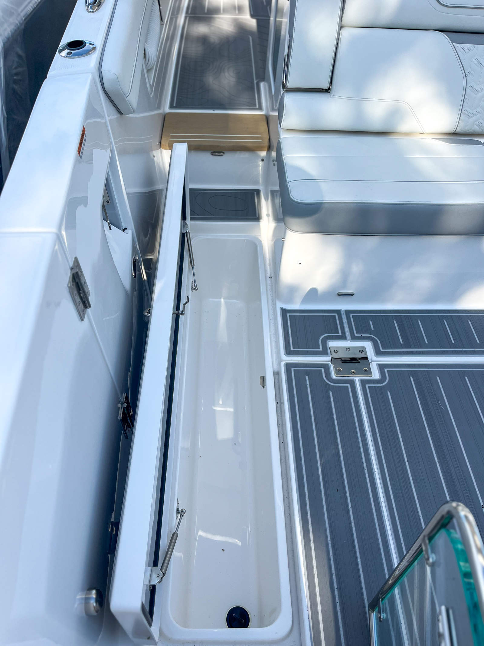 The Regal 38 SAV is as practical as it is luxurious. The anchor windlass with rope and chain simplifies the anchoring process, allowing you to secure your yacht quickly and confidently. Fender clips make docking straightforward, reducing stress and protecting your investment. The cockpit refrigerator is perfect for keeping snacks and beverages cool, ensuring you are always ready for a day of fun on the water.Storage solutions throughout the yacht provide plenty of space for gear, supplies, and personal items, keeping the deck clutter-free and organized. The efficient engine system not only delivers impressive power but also helps manage fuel consumption, making it easier to plan longer trips without frequent stops. The gray water system adds another layer of convenience, allowing you to enjoy extended stays on the water with minimal impact on the environment.