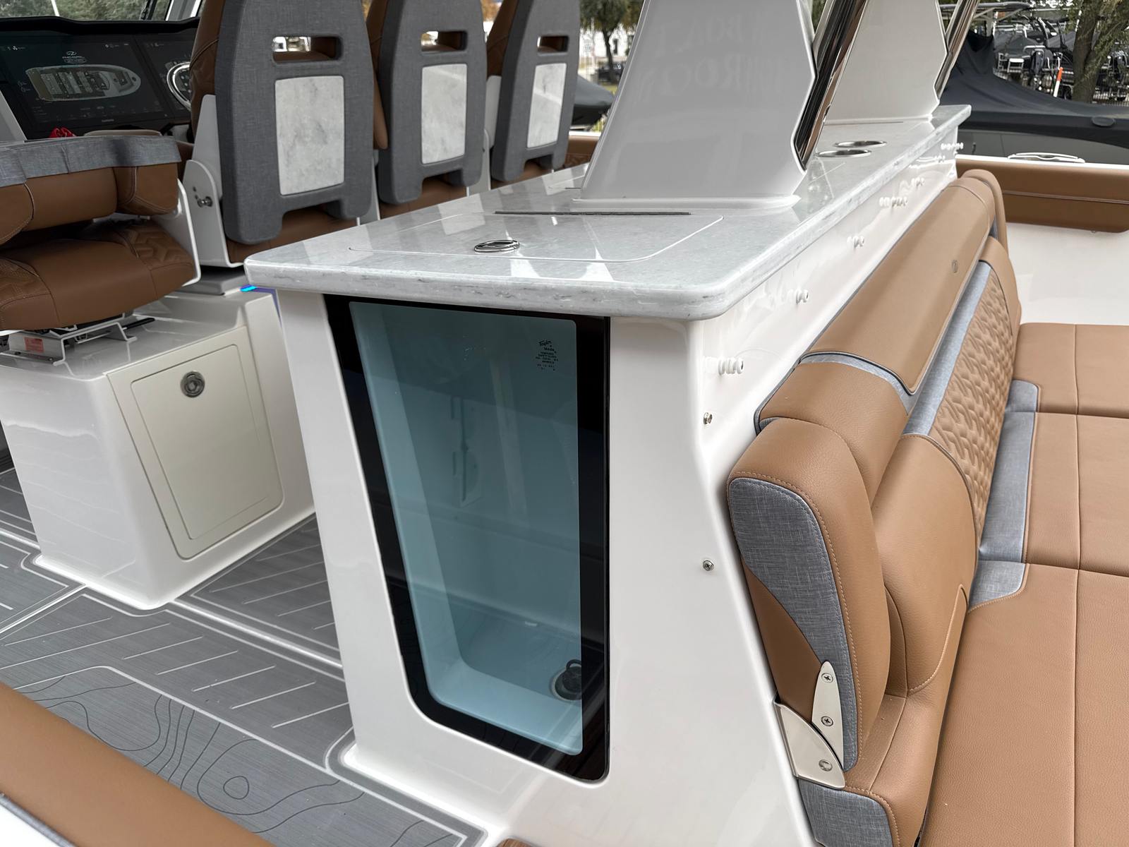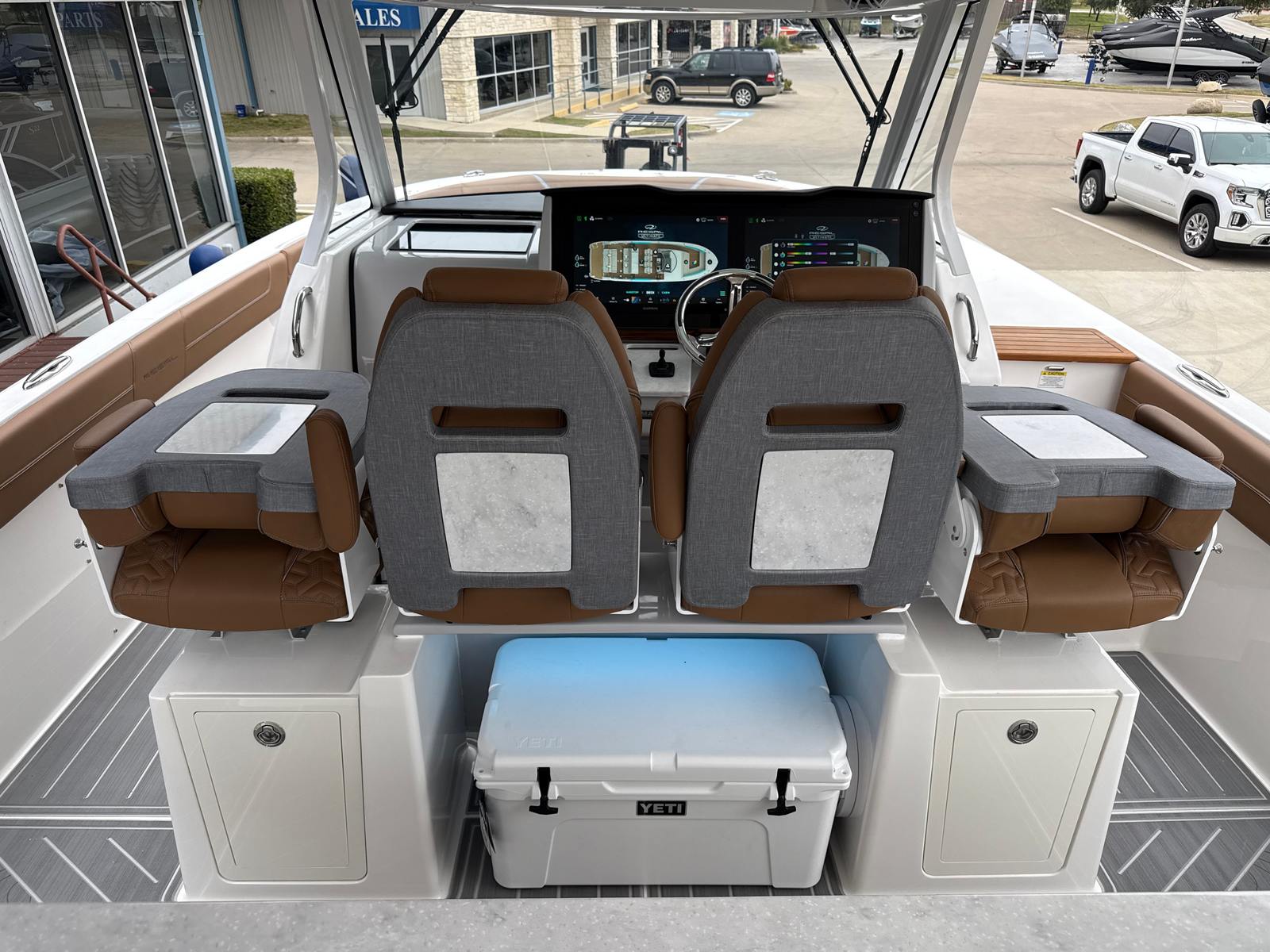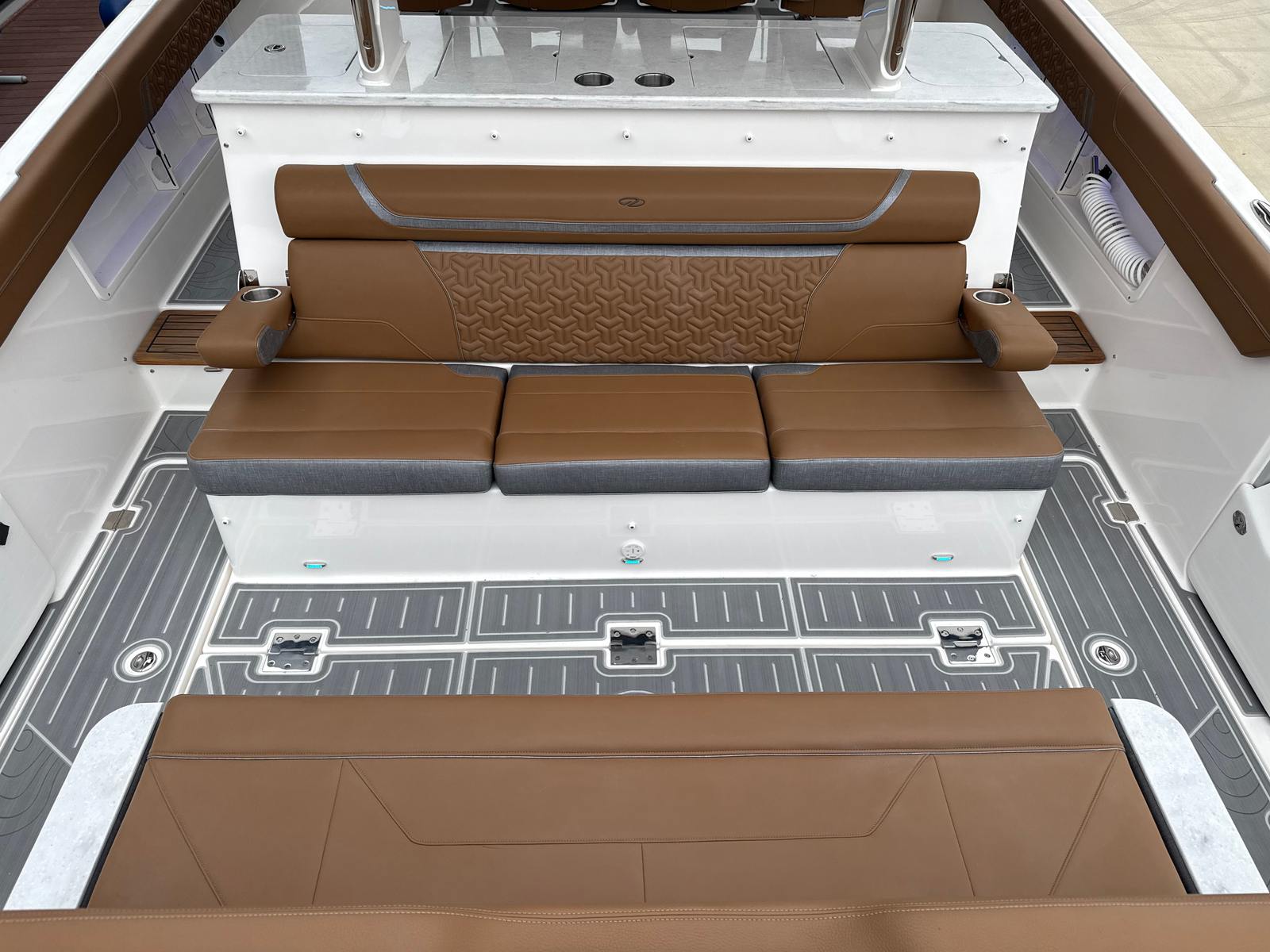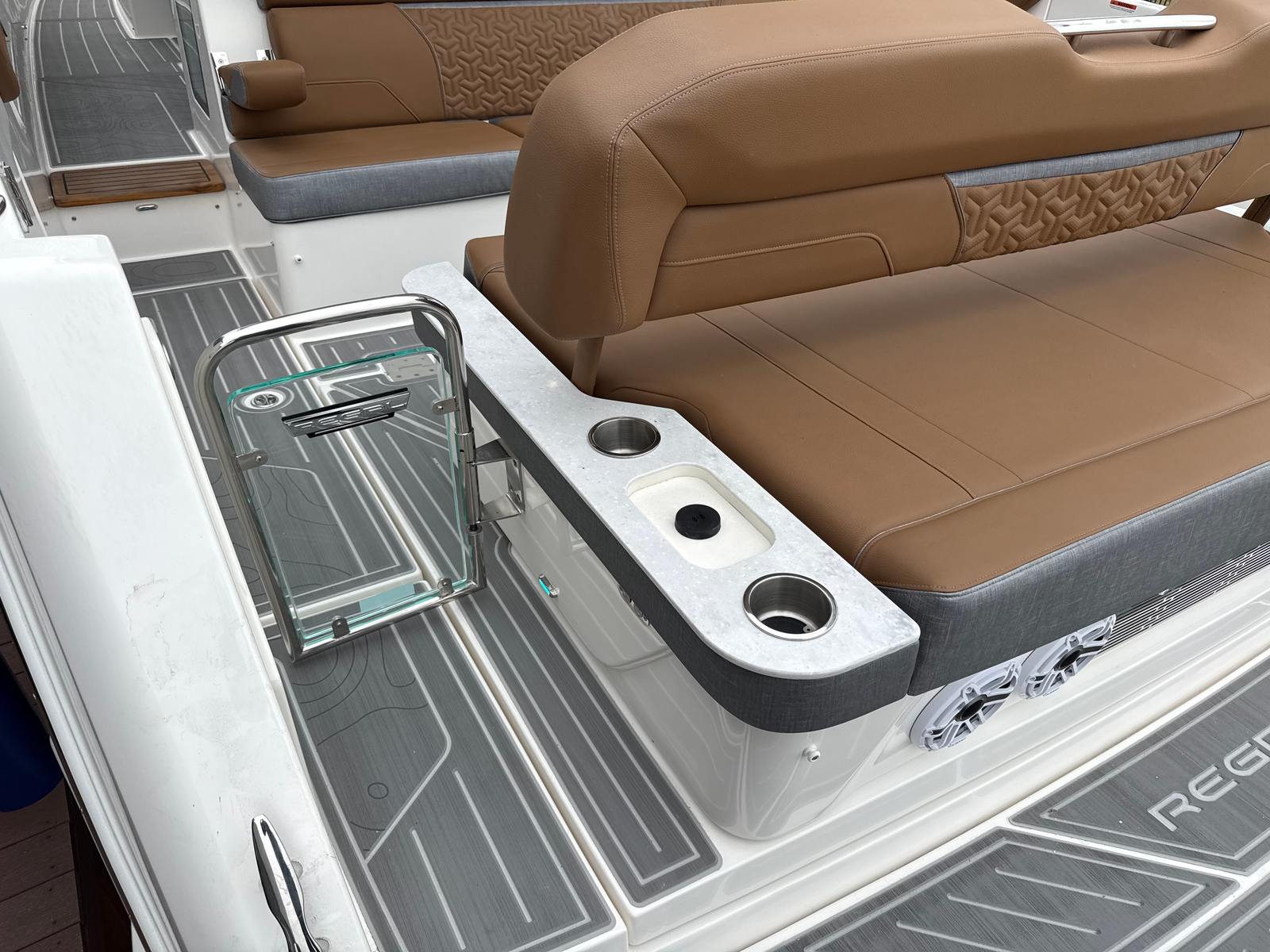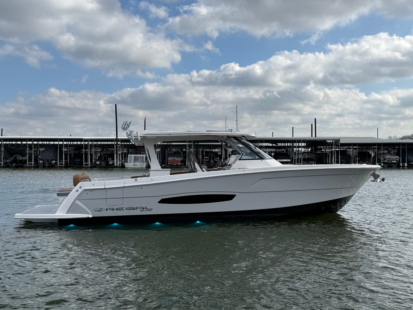 The Regal 38 Surf is designed with practicality in mind, making ownership as enjoyable as it is exciting. The intuitive joystick control system simplifies docking and maneuvering, reducing stress and making every trip more enjoyable. The ample storage options throughout the boat ensure that all your gear, water toys, and essentials are easily accessible and neatly stowed. The PowerShade feature provides adjustable sun protection, allowing you to stay cool and comfortable during long days on the water. The durable bottom paint and high-quality materials ensure that your investment remains protected and looking great for years to come.