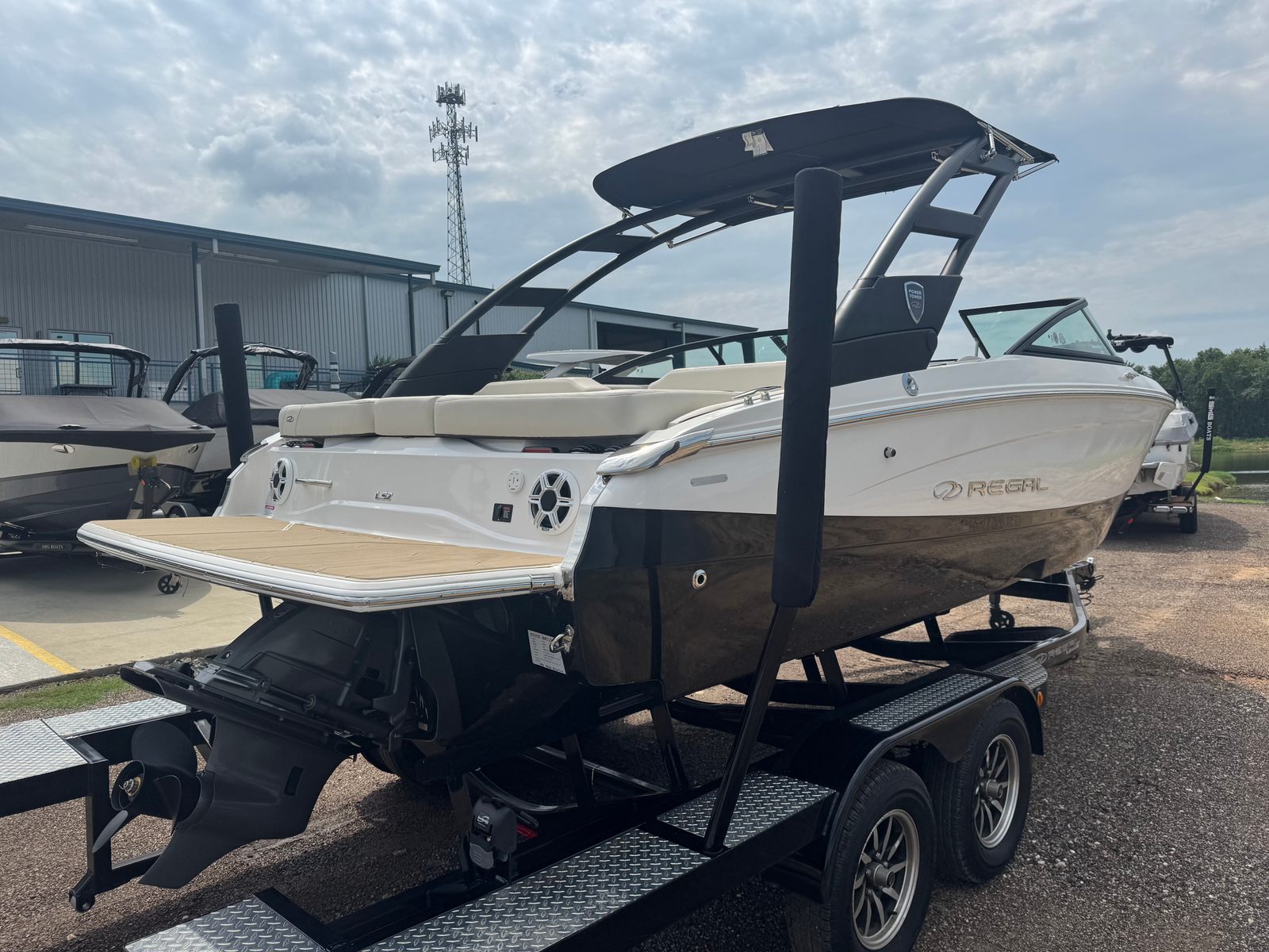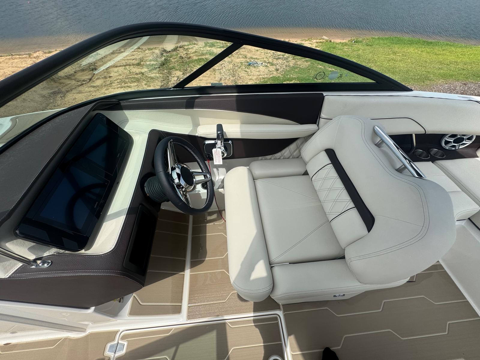The Regal LS2 Bowrider is packed with special features that elevate your boating experience. The SeaDek cockpit sole and SeaDek swim platform provide a comfortable, non-slip surface, perfect for barefoot relaxation or active water sports. The dual battery switch with tray and cables, along with a battery charger, ensures you have reliable power for all your onboard electronics and accessories. Docking lights make evening arrivals and departures safer and more convenient, while the travel storage cover in black keeps your boat protected when not in use. Every detail, from the stylish River Rock interior to the practical storage solutions, reflects Regal’s dedication to both luxury and functionality.