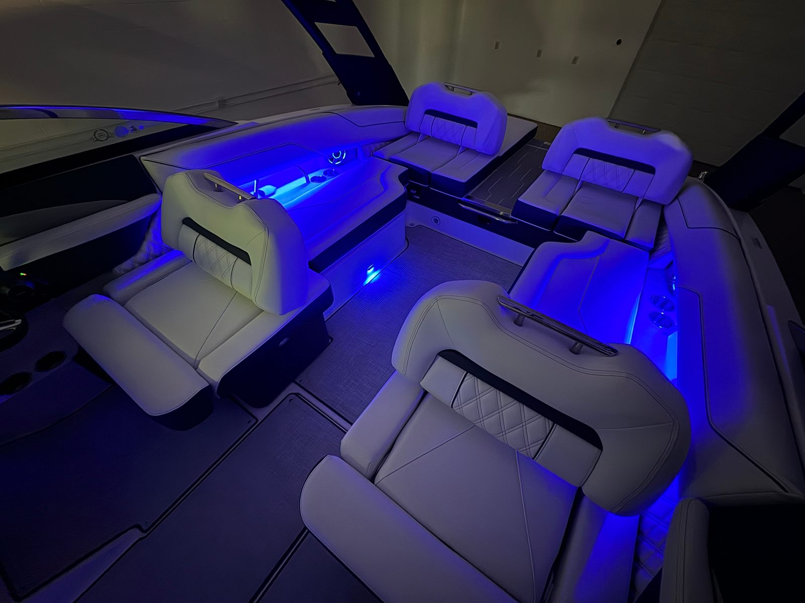 The Regal LS4 Surf is loaded with premium features designed to enhance comfort, convenience, and fun on the water. The Mediterranean Blue color scheme is complemented by Black canvas and Titanium accents, creating a stylish and inviting atmosphere throughout the boat. The included travel storage cover in Black ensures your investment is protected when not in use, while the Black canvas adds a touch of elegance and durability.Step into the cockpit and you will find a plush Seagrass Mat that provides a soft, comfortable surface underfoot, perfect for barefoot relaxation. The SeaDek Swim Platform offers a non-slip, cushioned area for easy access to the water, making it ideal for swimming, boarding, or lounging at anchor. The dual battery switch with tray and cables ensures reliable power management, so you can enjoy your day on the water without worry.