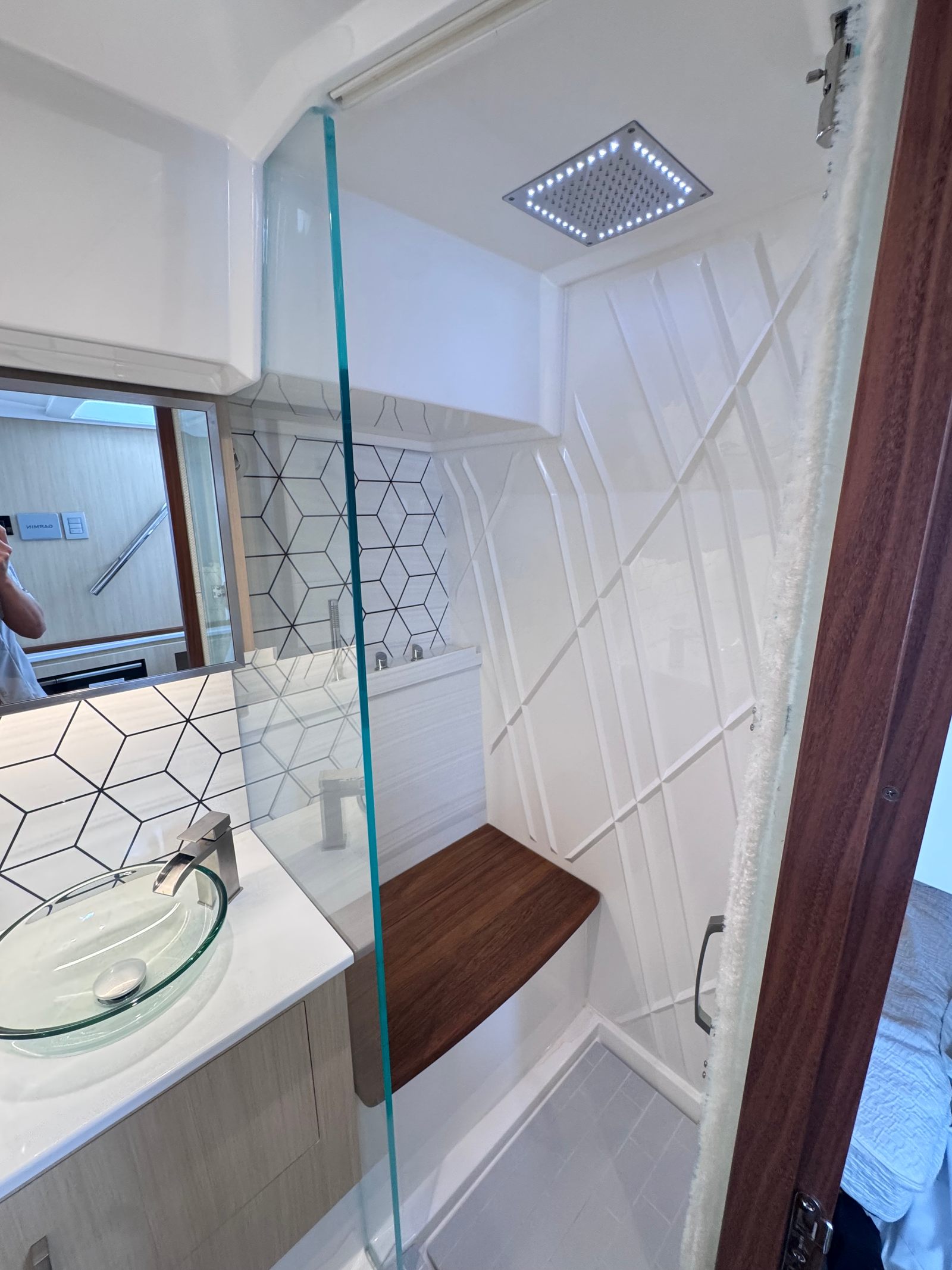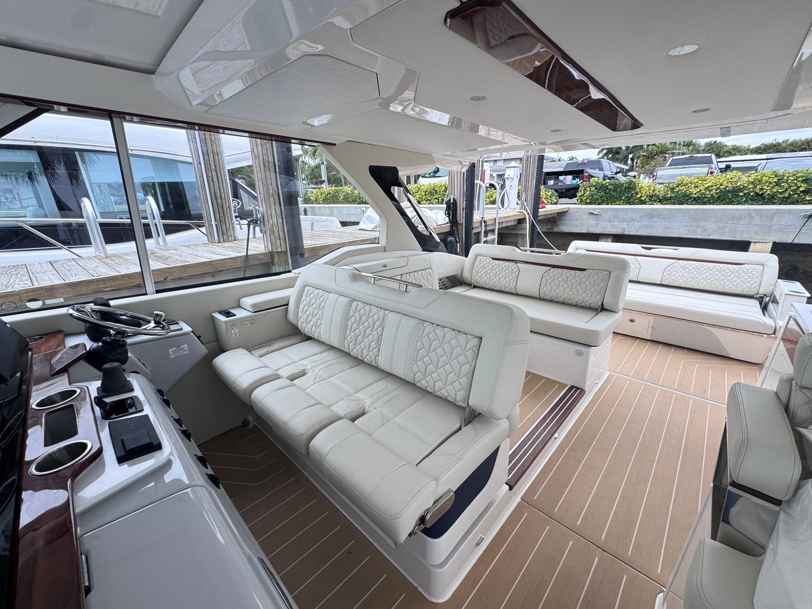The Regal LX43 is equipped with a suite of special features that set it apart from other yacht boats for sale. The PowerShade provides effortless protection from the sun, allowing you to enjoy the outdoors in comfort. The Bow Cover and Bow Sunshade System – Manual offer additional versatility, ensuring that the forward deck remains a welcoming space regardless of the weather. The Palm Beach Enclosure adds a touch of elegance and shelter, perfect for entertaining guests or relaxing in privacy.Inside the cockpit, you’ll find Cockpit Seat Covers in a crisp white canvas, offering both style and protection. The Synthetic Teak Cockpit Sole and Synthetic Teak Swim Platform deliver the look and feel of traditional teak with enhanced durability and low maintenance. High Gloss Teak Steps add a luxurious finishing touch, elevating the overall aesthetic and providing safe, slip-resistant access throughout the yacht.