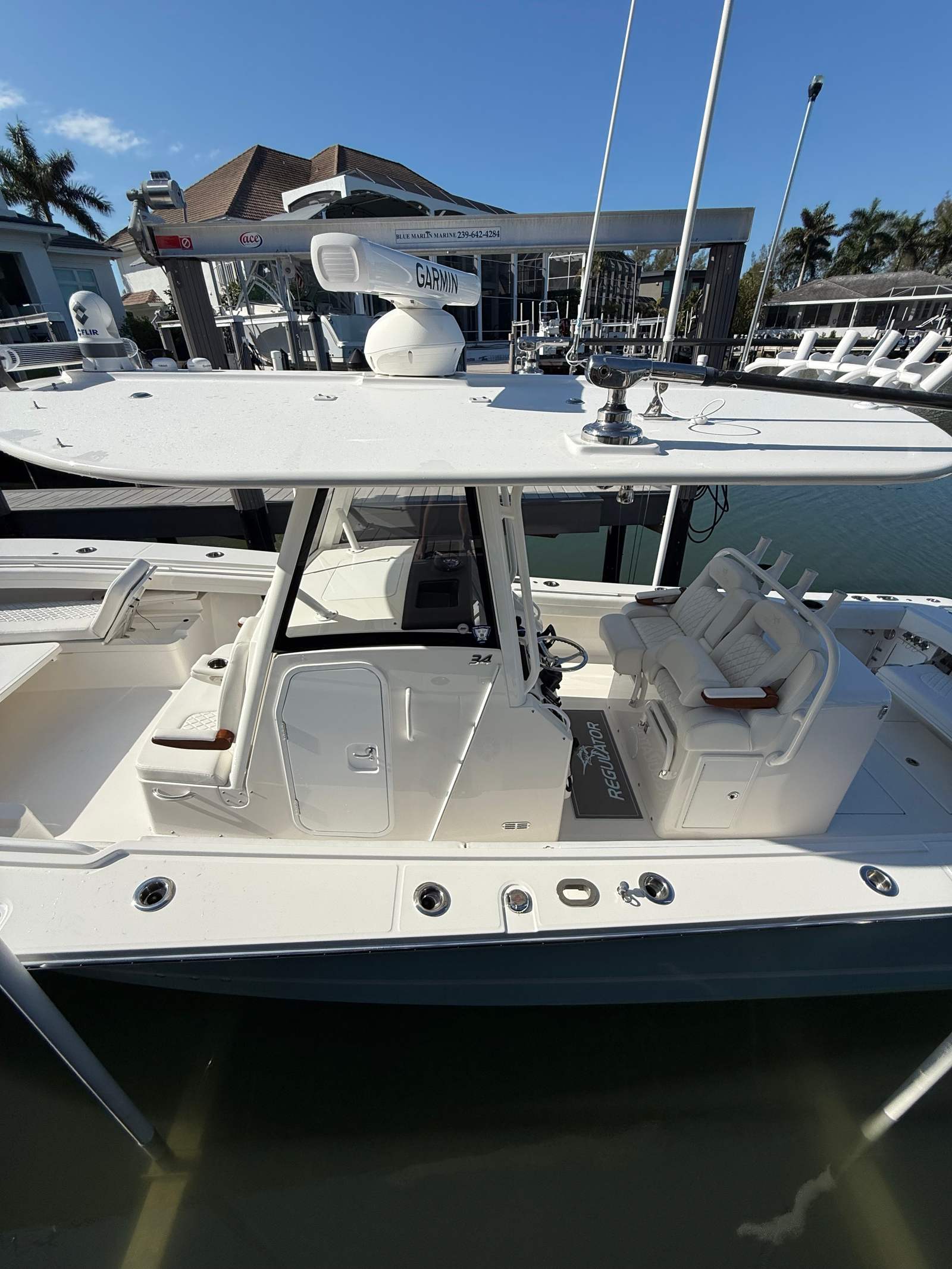 The Regulator 34 Center Console is designed with both anglers and leisure seekers in mind. Its spacious deck layout provides plenty of room for fishing, entertaining, or simply soaking up the sun. The ergonomic helm station offers excellent visibility and intuitive controls, making navigation a breeze. The boat’s robust construction and thoughtful design details ensure a safe and comfortable ride, even in challenging conditions.Special features of this 2024 Regulator 34 include its twin-engine configuration with a total of 600 horsepower and a well-maintained engine system with only 285 hours. The generous length of 33.83 feet provides ample space for guests, gear, and all your boating essentials. Every inch of the Regulator 34 is crafted to enhance your experience on the water, from the sturdy hull to the spacious deck.