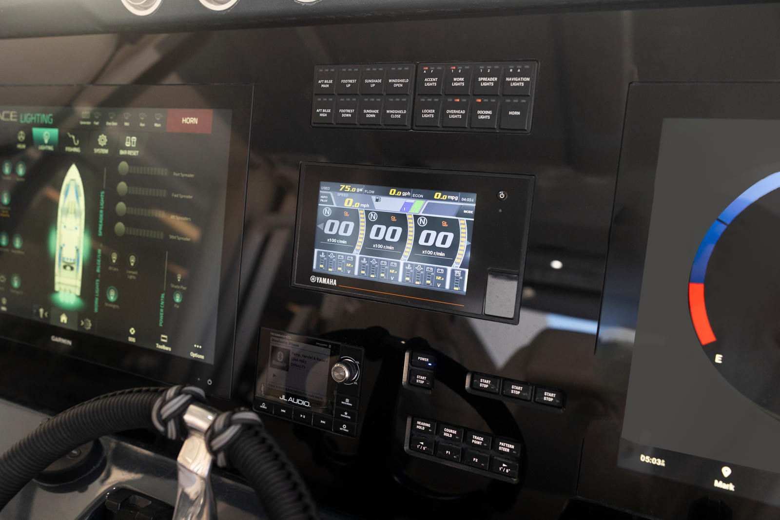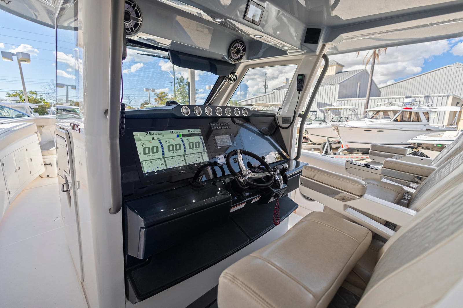 - Standard Package: 2x Garmin 8622 MFDs, 2x Garmin VHF w/ Remote Mount Mics, Garmin Fantom 24” 4KW Radar Dome, Airmar 500 CHIRP Transducer w/ Side Vu/Clear Vu, Garmin GSD 25 Sounder Module, 2x 21.5" LED Repeater Screens, Garmin Grid Remote MFD Controller