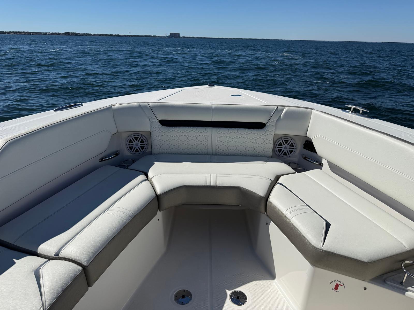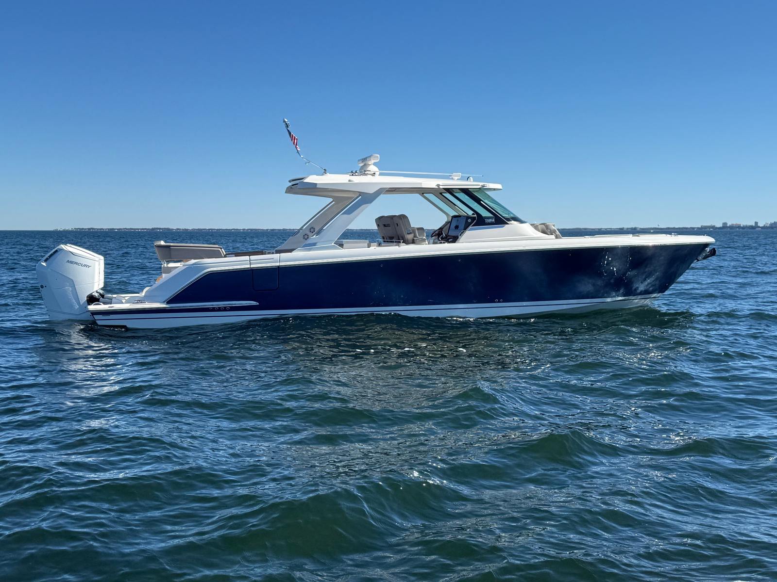 yacht with no wait time. Powered by twin Mercury 600hp V12 outboards with less than 80 hours, this vessel offers
